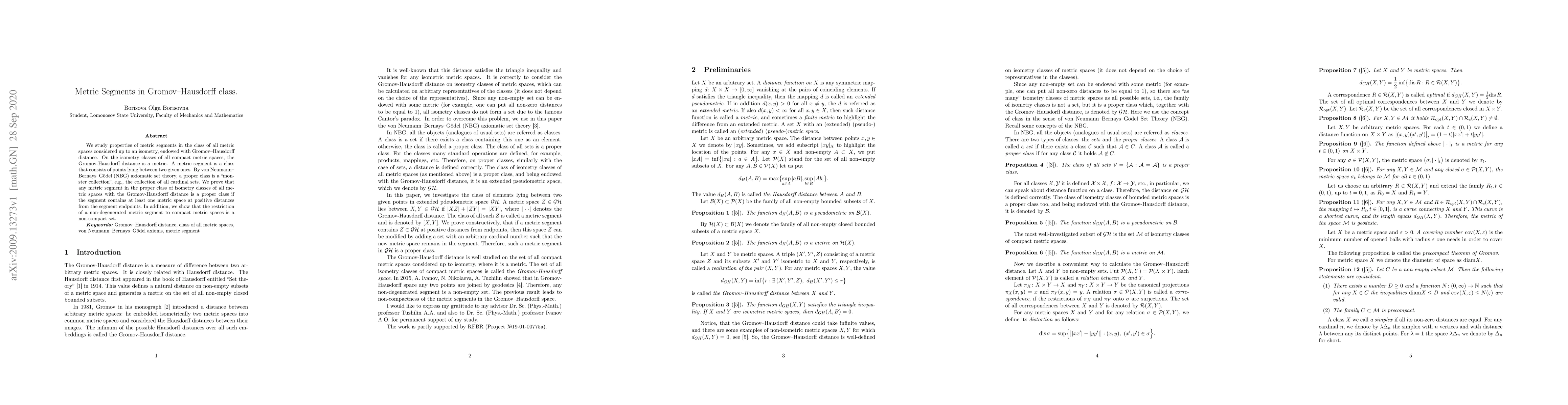 Summary: This paper explores the properties of metric segments within the isometry classes of compact metric spaces under the Gromov-Hausdorff distance, proving that such segments form proper classes when they contain spaces at positive distances from endpoints, and that their restrictions to compact spaces remain non-compact.