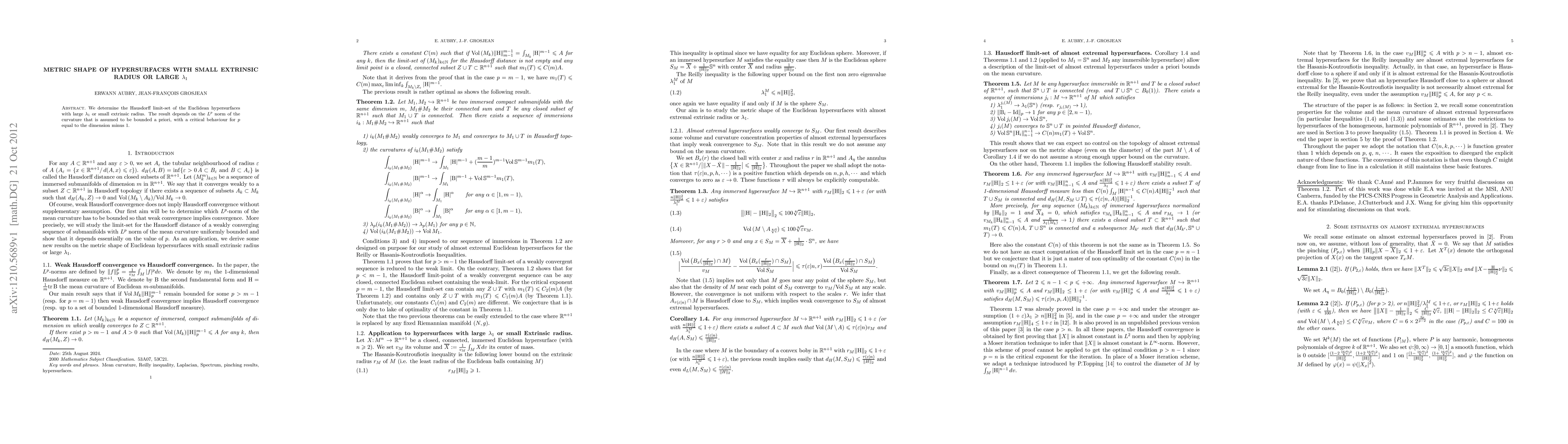 We determine the Hausdorff limit-set of the Euclidean hypersurfaces with large $\lambda_1$ or small extrinsic radius. The result depends on the $L^p$ norm of the curvature that is assumed to be bounded a priori, with a critical behaviour for $p$ equal to the dimension minus 1.