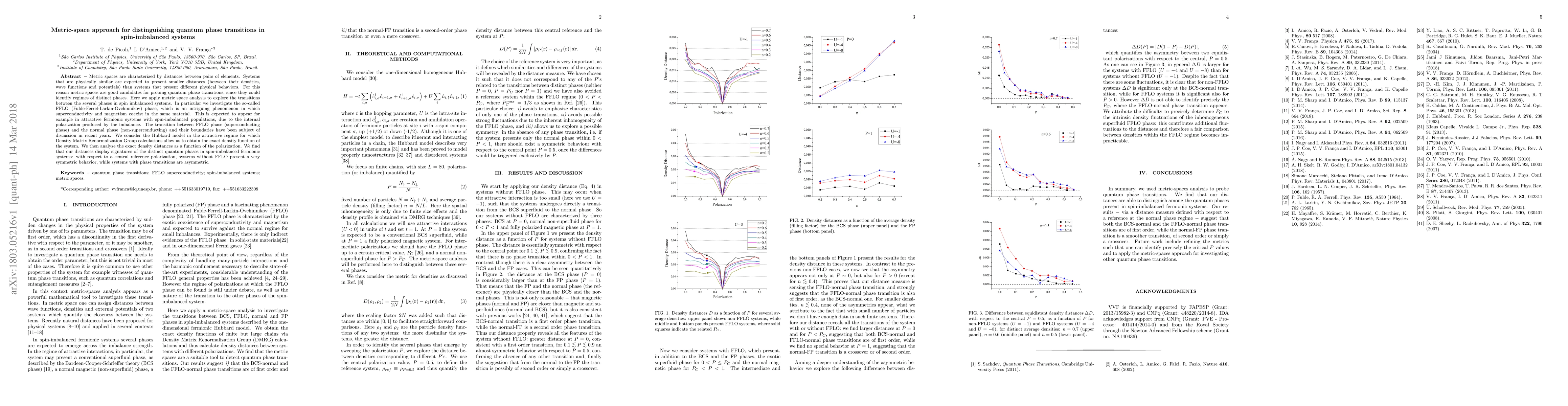 This paper uses metric space analysis to distinguish quantum phase transitions in spin-imbalanced systems, particularly focusing on the FFLO phase where superconductivity and magnetism coexist. The study finds that distance metrics between system densities reveal distinct signatures of the FFLO phase and normal phase transitions.