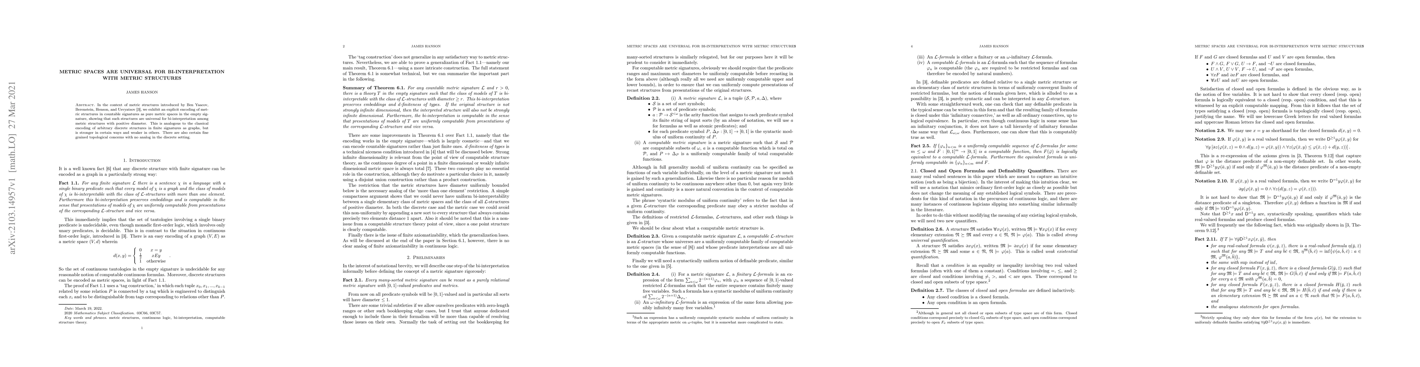 In the context of metric structures introduced by Ben Yaacov, Berenstein, Henson, and Usvyatsov, we exhibit an explicit encoding of metric structures in countable signatures as pure metric spaces in the empty signature, showing that such structures are universal for bi-interpretation among metric structures with positive diameter. This is analogous to the classical encoding of arbitrary discrete structures in finite signatures as graphs, but is stronger in certain ways and weaker in others. There are also certain fine grained topological concerns with no analog in the discrete setting.