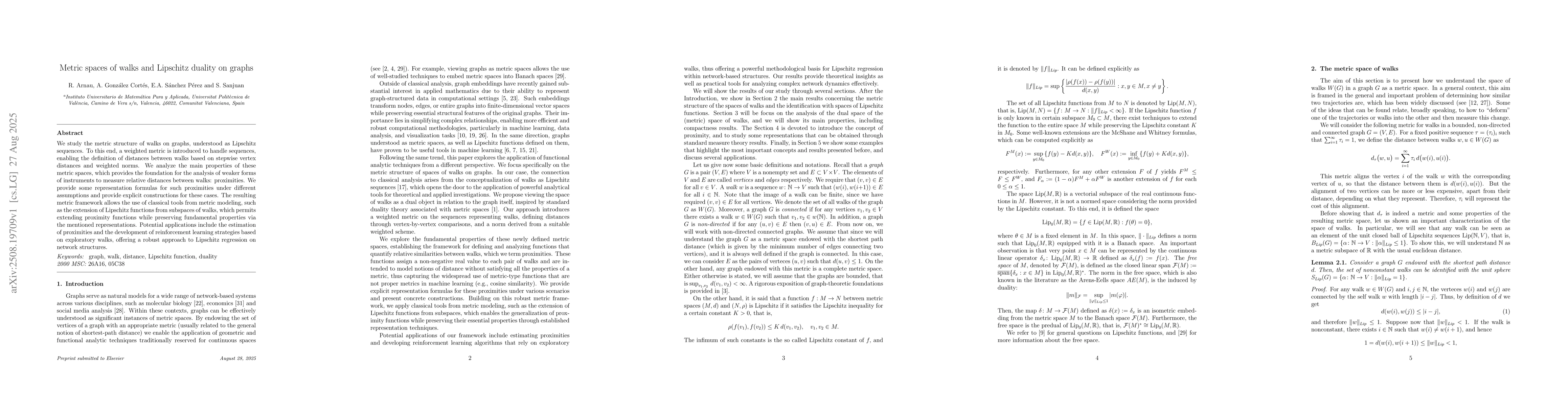 We study the metric structure of walks on graphs, understood as Lipschitz sequences. To this end, a weighted metric is introduced to handle sequences, enabling the definition of distances between walks based on stepwise vertex distances and weighted norms. We analyze the main properties of these metric spaces, which provides the foundation for the analysis of weaker forms of instruments to measure relative distances between walks: proximities. We provide some representation formulas for such proximities under different assumptions and provide explicit constructions for these cases. The resulting metric framework allows the use of classical tools from metric modeling, such as the extension of Lipschitz functions from subspaces of walks, which permits extending proximity functions while preserving fundamental properties via the mentioned representations. Potential applications include the estimation of proximities and the development of reinforcement learning strategies based on exploratory walks, offering a robust approach to Lipschitz regression on network structures.