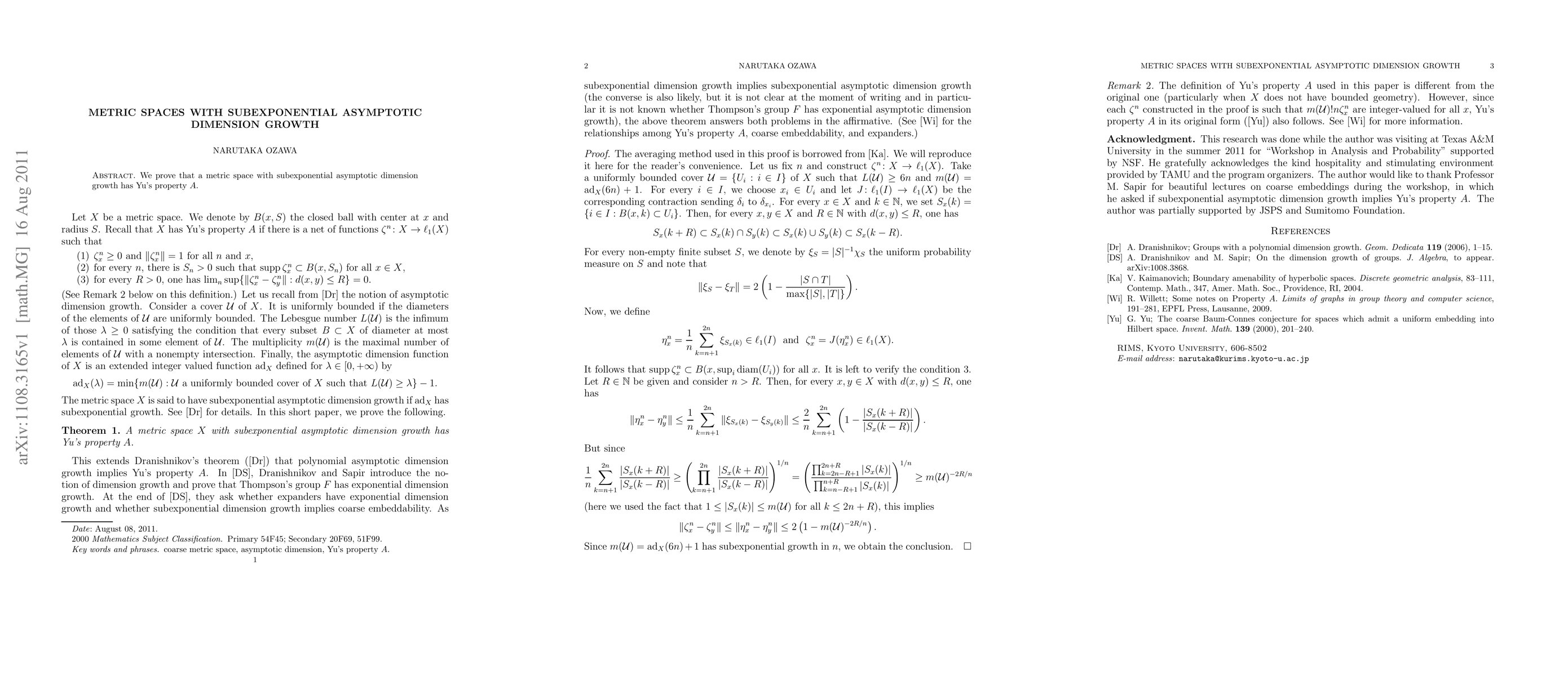 Summary: This paper demonstrates that a metric space exhibiting subexponential asymptotic dimension growth satisfies Yu's property A, establishing a connection between these two mathematical properties.