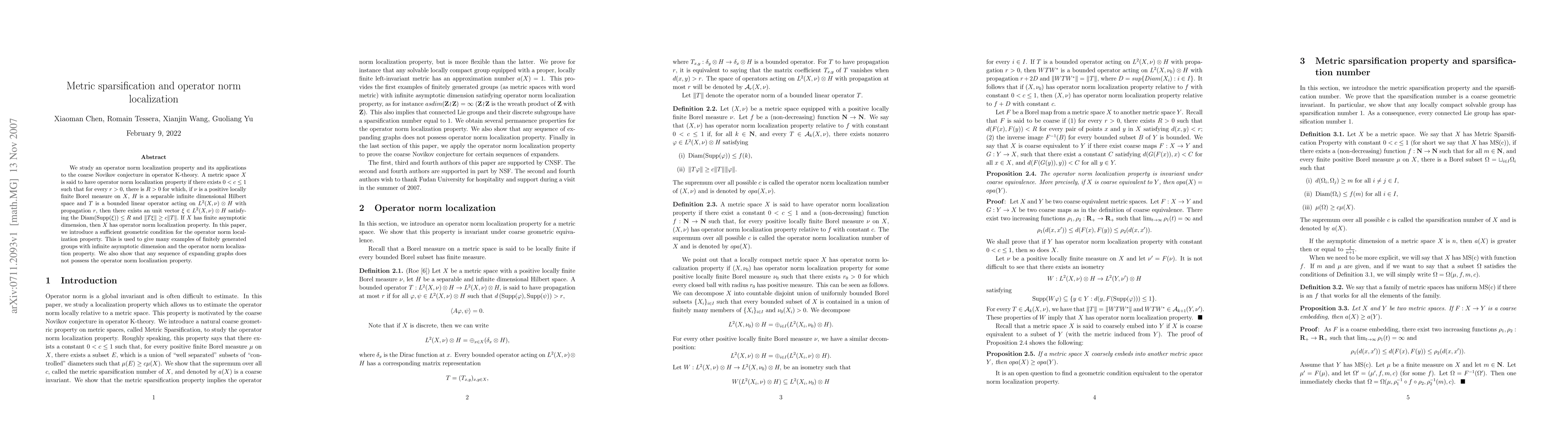 Researchers introduce a geometric condition for the operator norm localization property, which holds for finitely generated groups with infinite asymptotic dimension, and show that expanding graphs do not possess this property.