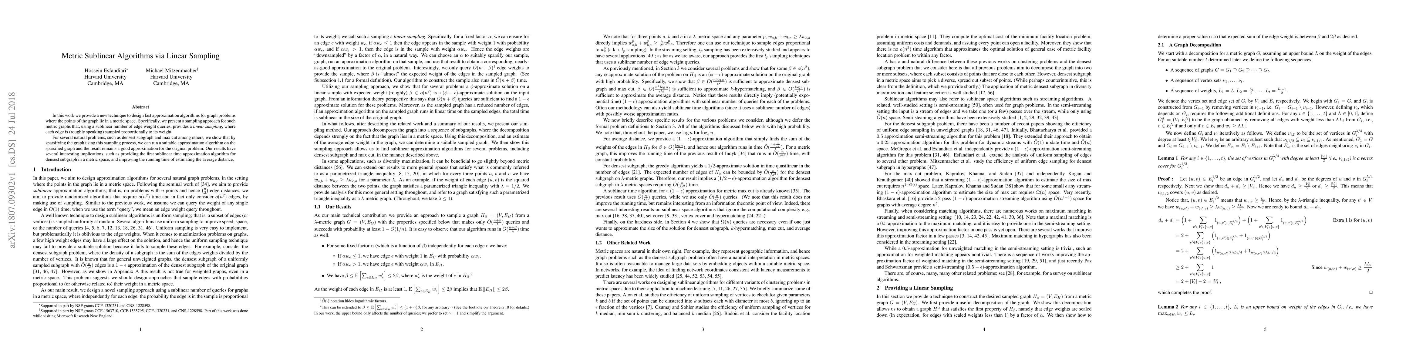 This paper introduces a novel sampling technique for designing fast approximation algorithms for graph problems in metric spaces, achieving sublinear query complexity. By employing linear sampling proportional to edge weights, it enables effective sparsification, maintaining good approximations for problems like densest subgraph and max cut.