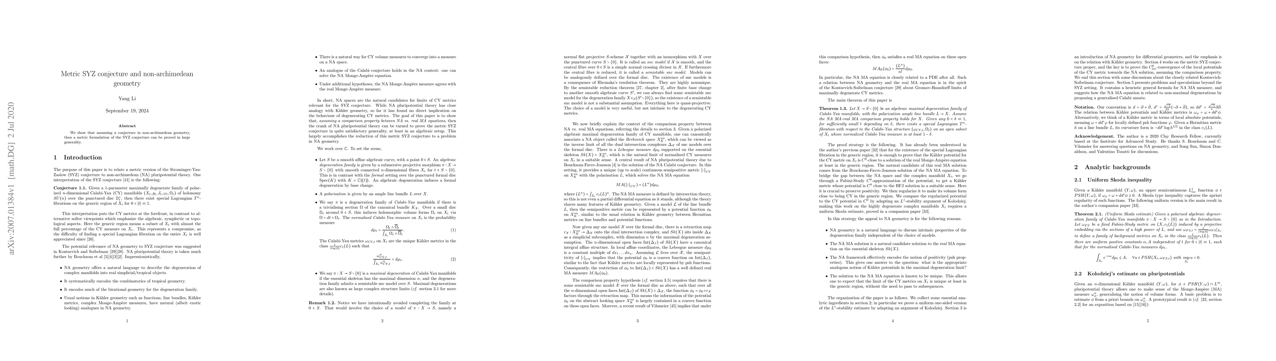 Summary: This paper proves a metric version of the SYZ conjecture in broad cases, assuming a conjecture in non-archimedean geometry holds true. The result bridges insights from non-archimedean geometry to the SYZ conjecture.