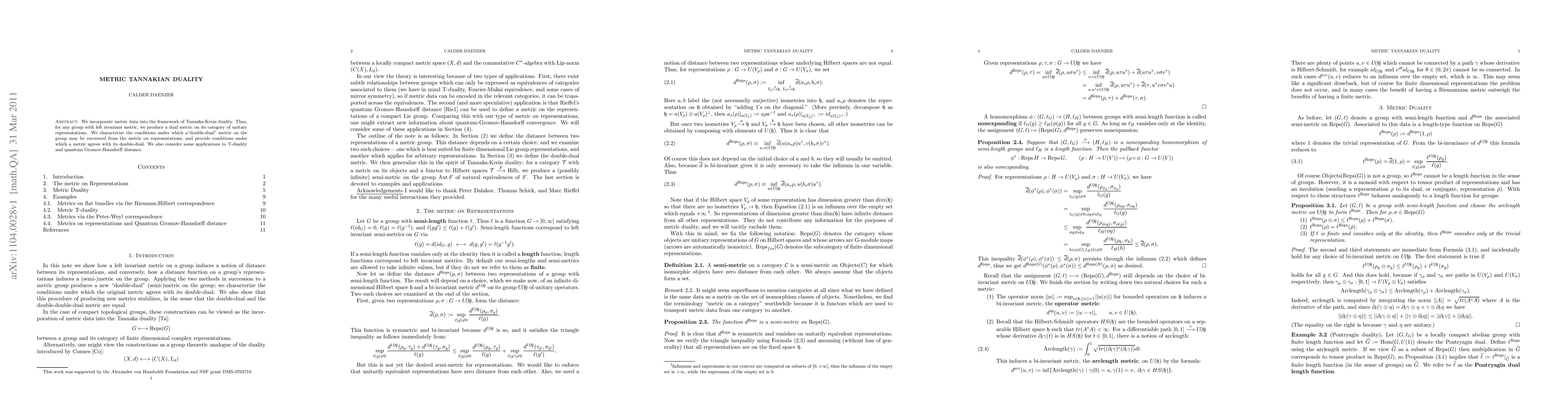 We incorporate metric data into the framework of Tannaka-Krein duality. Thus, for any group with left invariant metric, we produce a dual metric on its category of unitary representations. We characterize the conditions under which a "double-dual" metric on the group may be recovered from the metric on representations, and provide conditions under which a metric agrees with its double-dual. We also consider some applications to T-duality and quantum Gromov-Hausdorff distance.