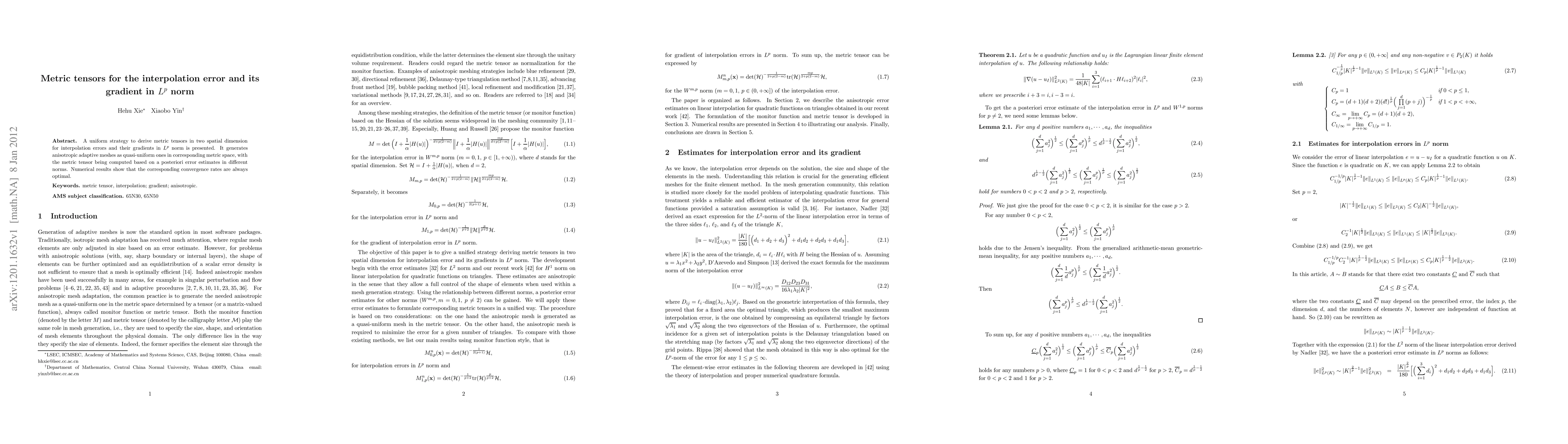 A uniform strategy to derive metric tensors in two spatial dimension for interpolation errors and their gradients in $L^p$ norm is presented. It generates anisotropic adaptive meshes as quasi-uniform ones in corresponding metric space, with the metric tensor being computed based on a posteriori error estimates in different norms. Numerical results show that the corresponding convergence rates are always optimal.