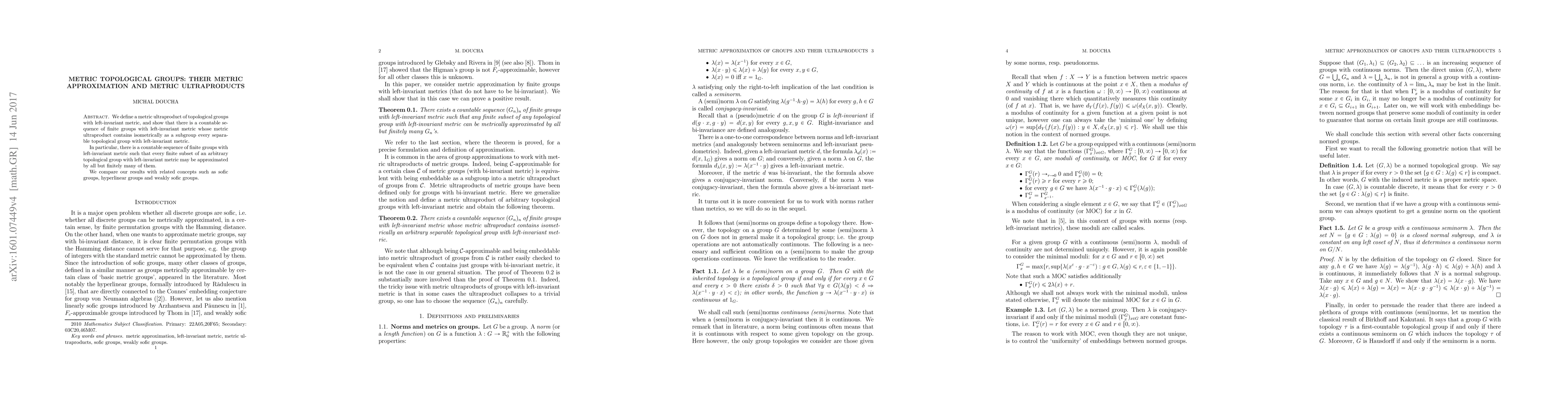 We define a metric ultraproduct of topological groups with left-invariant metric, and show that there is a countable sequence of finite groups with left-invariant metric whose metric ultraproduct contains isometrically as a subgroup every separable topological group with left-invariant metric. In particular, there is a countable sequence of finite groups with left-invariant metric such that every finite subset of an arbitrary topological group with left-invariant metric may be approximated by all but finitely many of them. We compare our results with related concepts such as sofic groups, hyperlinear groups and weakly sofic groups.