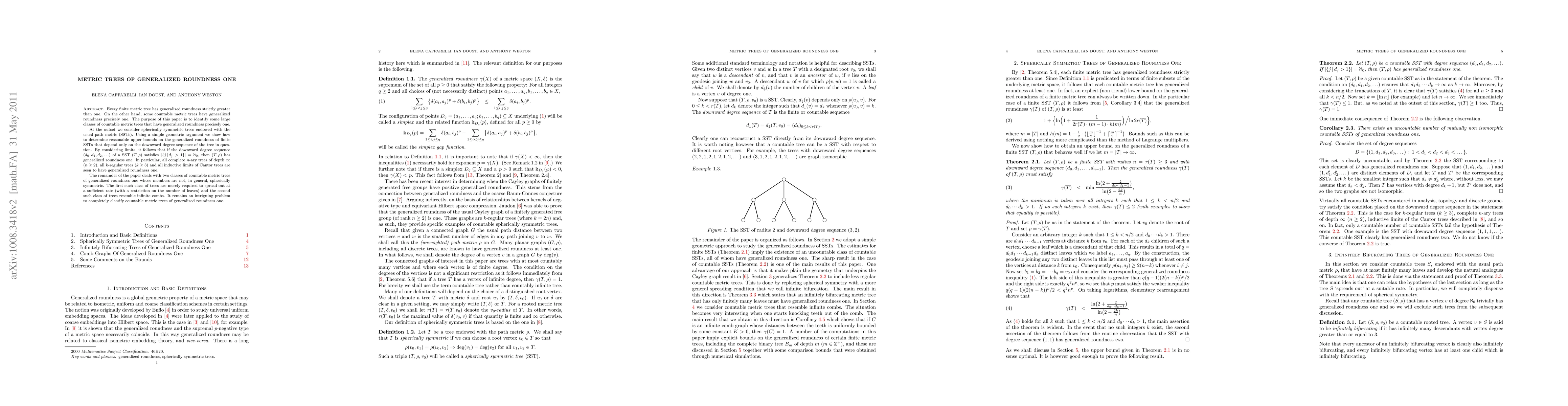 Every finite metric tree has generalized roundness strictly greater than one. On the other hand, some countable metric trees have generalized roundness precisely one. The purpose of this paper is to identify some large classes of countable metric trees that have generalized roundness precisely one. At the outset we consider spherically symmetric trees endowed with the usual combinatorial metric (SSTs). Using a simple geometric argument we show how to determine decent upper bounds on the generalized roundness of finite SSTs that depend only on the downward degree sequence of the tree in question. By considering limits it follows that if the downward degree sequence $(d_{0}, d_{1}, d_{2}...)$ of a SST $(T,\rho)$ satisfies $|\{j \, | \, d_{j} > 1 \}| = \aleph_{0}$, then $(T,\rho)$ has generalized roundness one. Included among the trees that satisfy this condition are all complete $n$-ary trees of depth $\infty$ ($n \geq 2$), all $k$-regular trees ($k \geq 3$) and inductive limits of Cantor trees. The remainder of the paper deals with two classes of countable metric trees of generalized roundness one whose members are not, in general, spherically symmetric. The first such class of trees are merely required to spread out at a sufficient rate (with a restriction on the number of leaves) and the second such class of trees resemble infinite combs.