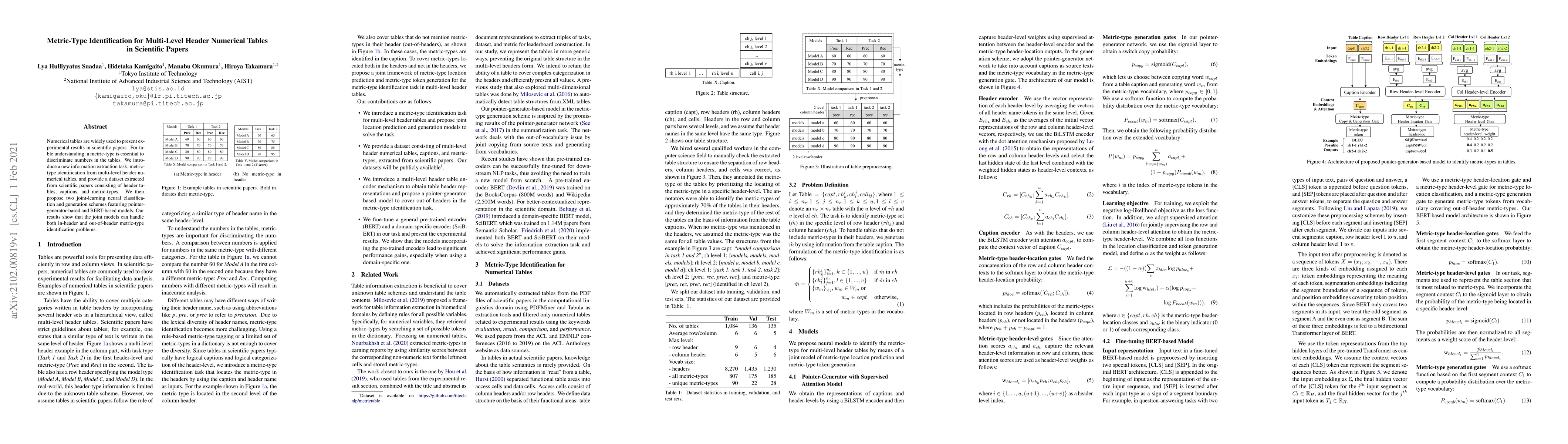 Numerical tables are widely used to present experimental results in scientific papers. For table understanding, a metric-type is essential to discriminate numbers in the tables. We introduce a new information extraction task, metric-type identification from multi-level header numerical tables, and provide a dataset extracted from scientific papers consisting of header tables, captions, and metric-types. We then propose two joint-learning neural classification and generation schemes featuring pointer-generator-based and BERT-based models. Our results show that the joint models can handle both in-header and out-of-header metric-type identification problems.