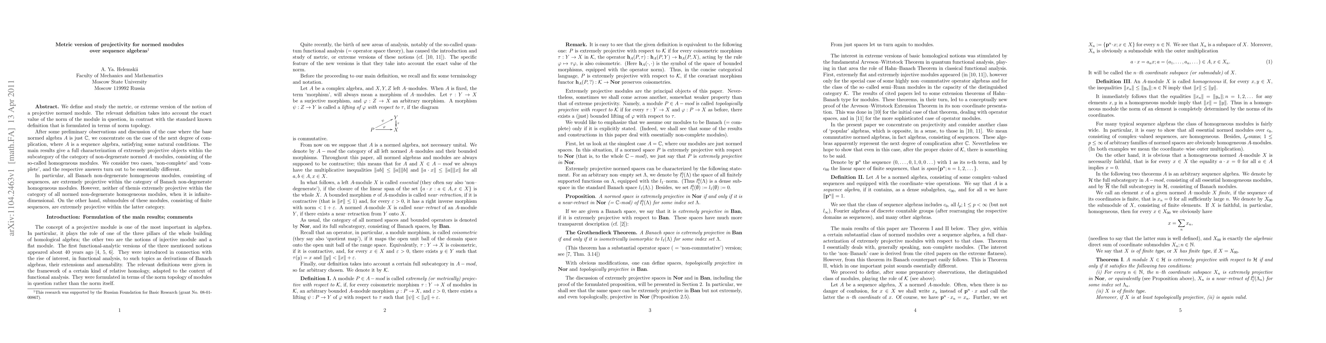We define and study the metric, or extreme version of the notion of a projective normed module. The relevant definition takes into account the exact value of the norm of the module in question, in contrast with the standard known definition that is formulated in terms of norm topology. After some preliminary observations and discussion of the case where the base normed algebra A is just the field of complex numbers, we concentrate on the case of the next degree of complication, where A is a sequence algebra, satisfying some natural conditions. The main results give a full characterization of extremely projective objects within the subcategory of the category of non-degenerate normed A-modules, consisting of the so-called homogeneous modules. We consider two cases, `non-complete' and `complete', and the respective answers turn out to be essentially different. In particular, all Banach non-degenerate homogeneous modules, consisting of sequences, are extremely projective within the category of Banach non-degenerate homogeneous modules. However, neither of them is extremely projective within the category of all normed non-degenerate homogeneous modules, when it is infinite-dimensional. On the other hand, submodules of these modules, consisting of finite sequences, are extremely projective within the latter category.