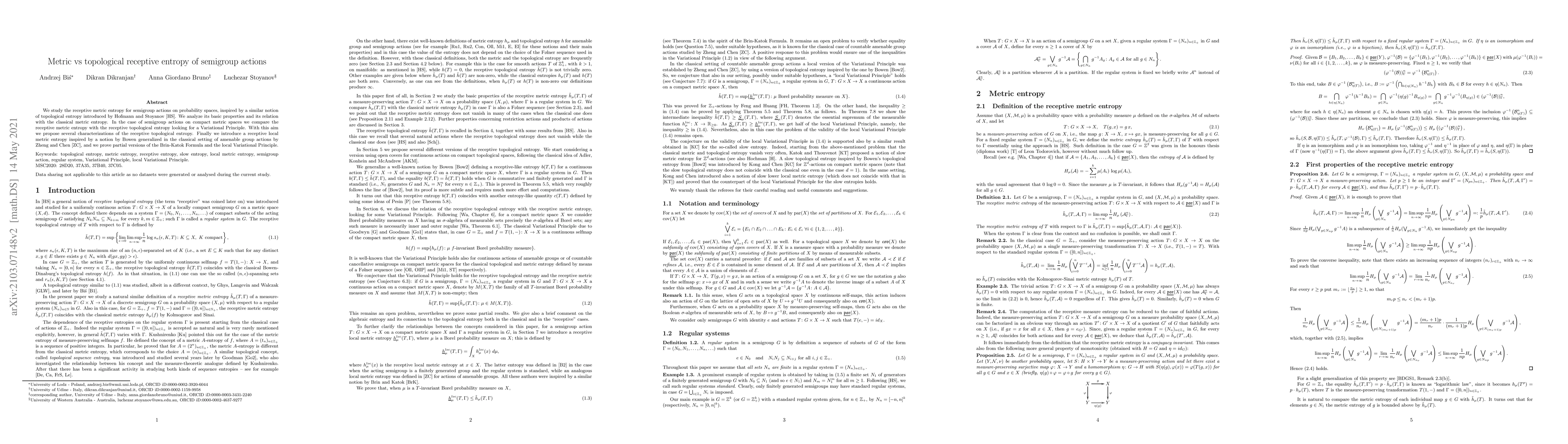 This paper investigates the receptive metric entropy for semigroup actions on probability spaces, comparing it with receptive topological entropy and exploring their variational principles. It introduces a receptive local metric entropy and proves partial versions of the Brin-Katok Formula and the local Variational Principle.