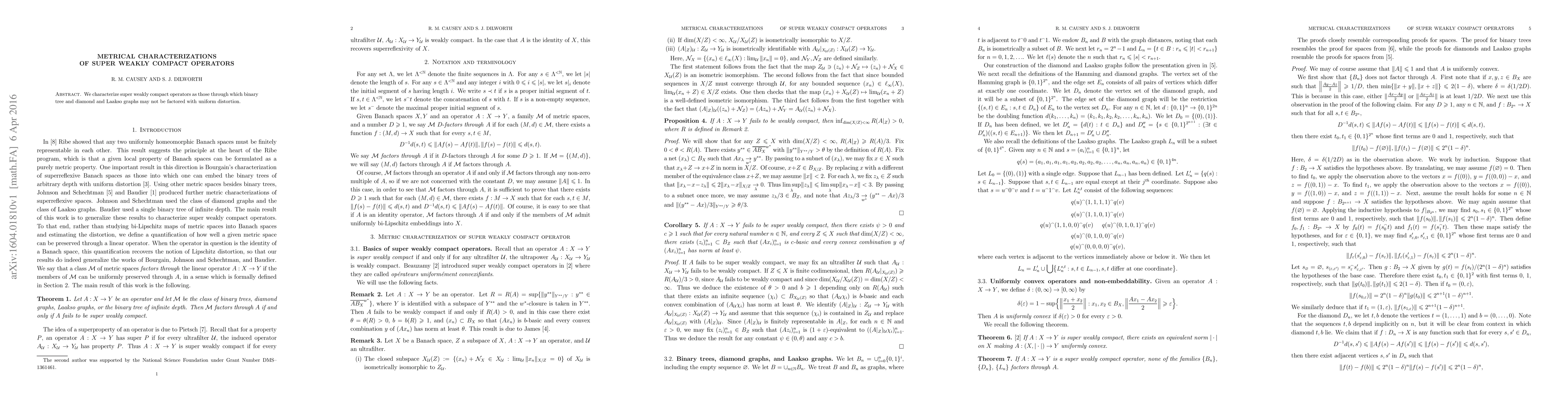 We characterize super weakly compact operators as those through which binary tree and diamond and Laakso graphs may not be factored with uniform distortion.