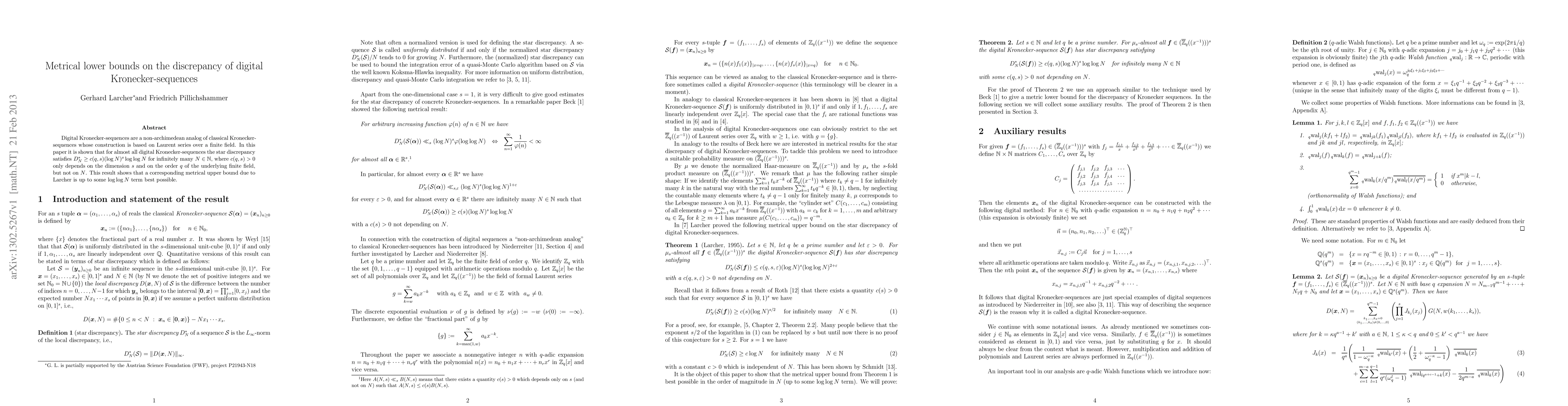 Digital Kronecker-sequences are a non-archimedean analog of classical Kronecker-sequences whose construction is based on Laurent series over a finite field. In this paper it is shown that for almost all digital Kronecker-sequences the star discrepancy satisfies $D_N^\ast \ge c(q,s) (\log N)^s \log \log N$ for infinitely many $N \in \NN$, where $c(q,s)>0$ only depends on the dimension $s$ and on the order $q$ of the underlying finite field, but not on $N$. This result shows that a corresponding metrical upper bound due to Larcher is up to some $\log \log N$ term best possible.