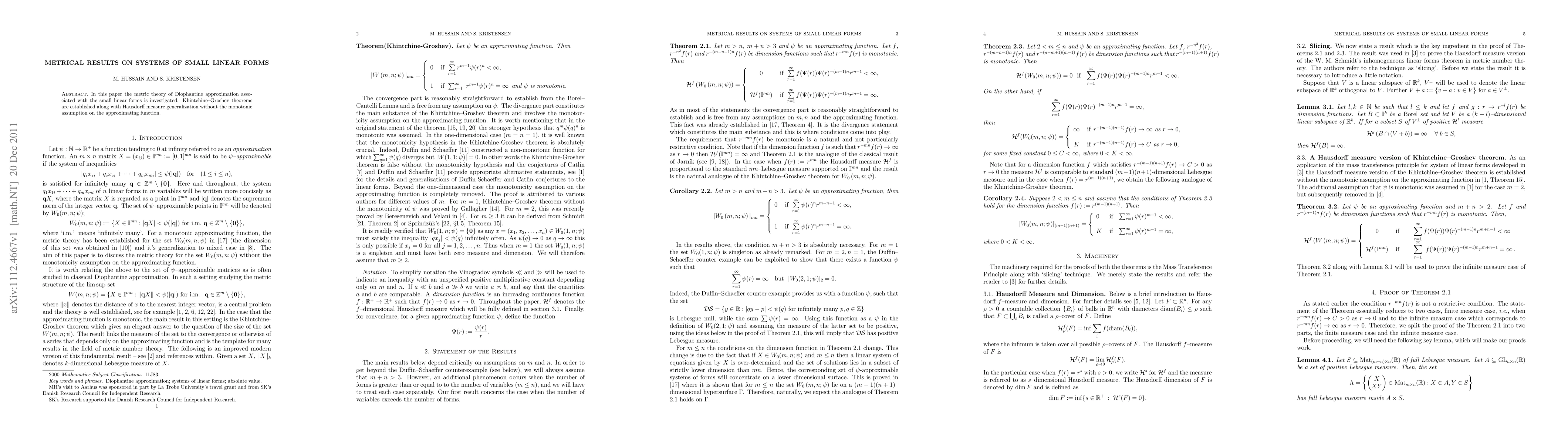 This paper explores the metric theory of Diophantine approximation for small linear forms, establishing Khintchine-Groshev theorems and generalizing Hausdorff measure results without requiring monotonicity of the approximating function.
