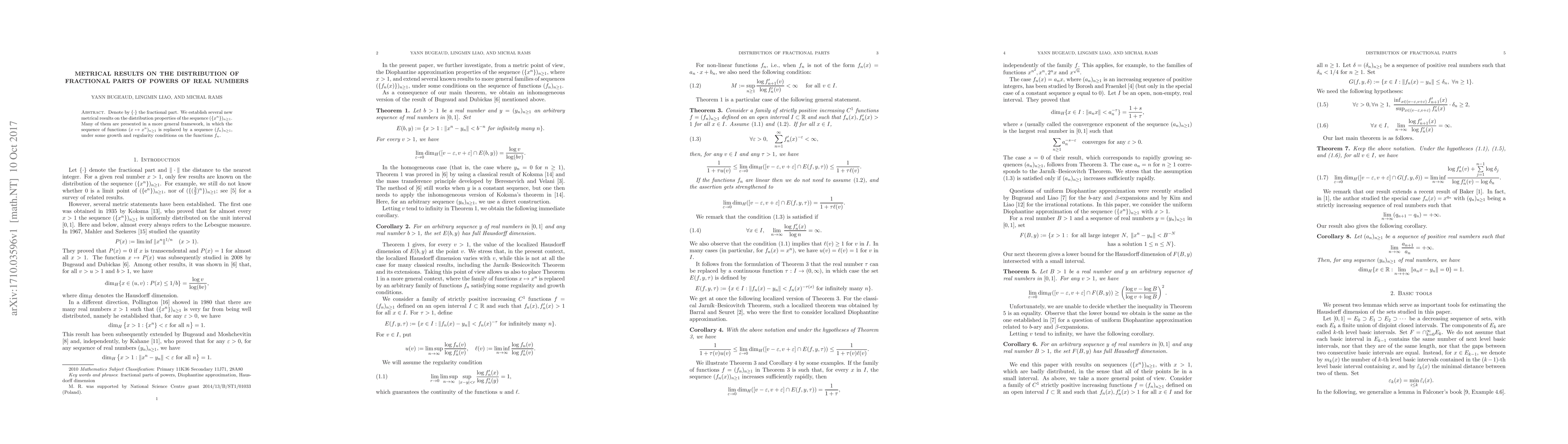 Denote by {$\times$} the fractional part. We establish several new metrical results on the distribution properties of the sequence ({x n }) n$\ge$1. Many of them are presented in a more general framework, in which the sequence of functions (x $\rightarrow$ x n) n$\ge$1 is replaced by a sequence (fn) n$\ge$1 , under some growth and regularity conditions on the functions fn.