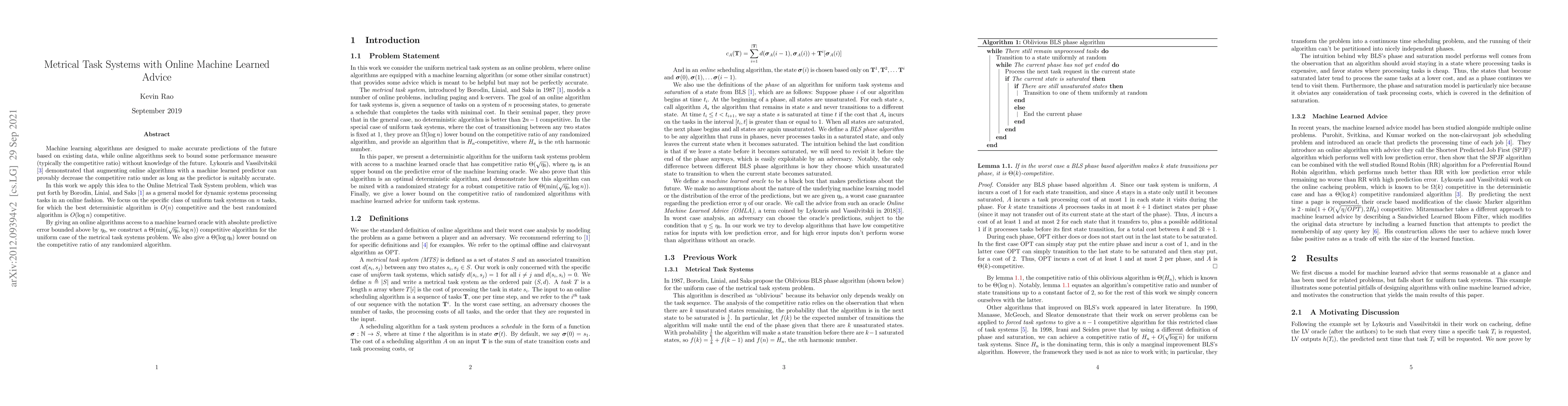 Machine learning algorithms are designed to make accurate predictions of the future based on existing data, while online algorithms seek to bound some performance measure (typically the competitive ratio) without knowledge of the future. Lykouris and Vassilvitskii demonstrated that augmenting online algorithms with a machine learned predictor can provably decrease the competitive ratio under as long as the predictor is suitably accurate. In this work we apply this idea to the Online Metrical Task System problem, which was put forth by Borodin, Linial, and Saks as a general model for dynamic systems processing tasks in an online fashion. We focus on the specific class of uniform task systems on $n$ tasks, for which the best deterministic algorithm is $O(n)$ competitive and the best randomized algorithm is $O(\log n)$ competitive. By giving an online algorithms access to a machine learned oracle with absolute predictive error bounded above by $\eta_0$, we construct a $\Theta(\min(\sqrt{\eta_0}, \log n))$ competitive algorithm for the uniform case of the metrical task systems problem. We also give a $\Theta(\log \eta_0)$ lower bound on the competitive ratio of any randomized algorithm.
