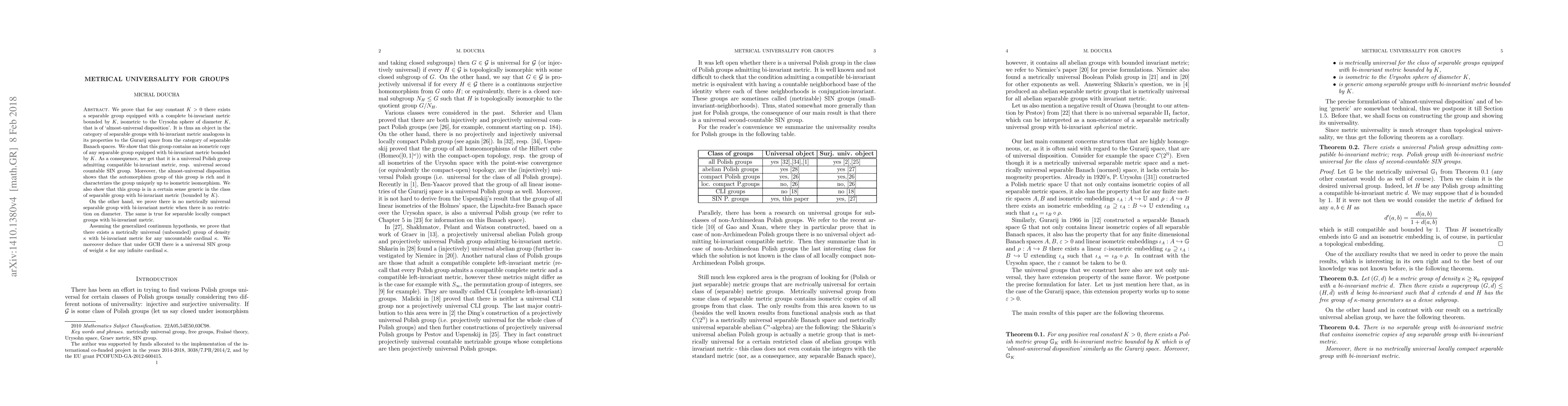 We prove that for any constant $K>0$ there exists a separable group equipped with a complete bi-invariant metric bounded by $K$, isometric to the Urysohn sphere of diameter $K$, that is of `almost-universal disposition'. It is thus an object in the category of separable groups with bi-invariant metric analogous in its properties to the Gurarij space from the category of separable Banach spaces. We show that this group contains an isometric copy of any separable group equipped with bi-invariant metric bounded by $K$. As a consequence, we get that it is a universal Polish group admitting compatible bi-invariant metric, resp. universal second countable SIN group. Moreover, the almost-universal disposition shows that the automorphism group of this group is rich and it characterizes the group uniquely up to isometric isomorphism. We also show that this group is in a certain sense generic in the class of separable group with bi-invariant metric (bounded by $K$). On the other hand, we prove there is no metrically universal separable group with bi-invariant metric when there is no restriction on diameter. The same is true for separable locally compact groups with bi-invariant metric. Assuming the generalized continuum hypothesis, we prove that there exists a metrically universal (unbounded) group of density $\kappa$ with bi-invariant metric for any uncountable cardinal $\kappa$. We moreover deduce that under GCH there is a universal SIN group of weight $\kappa$ for any infinite cardinal $\kappa$.