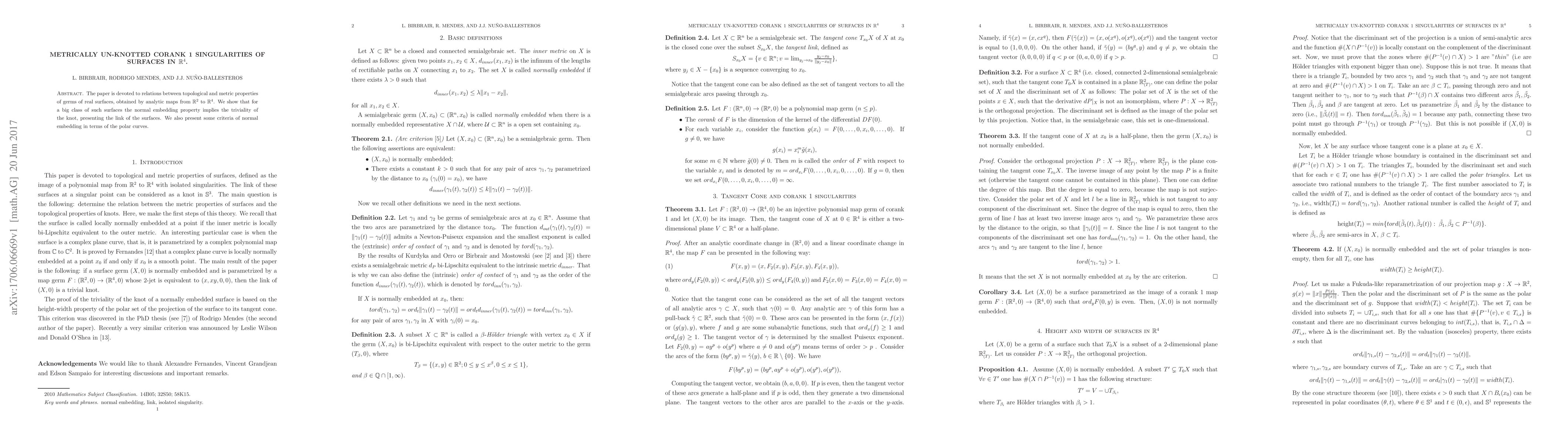 The paper explores the connection between topological and metric properties of real surface singularities in $\mathbb{R}^4$, demonstrating that normal embedding leads to the triviality of associated knot links. It also provides criteria for normal embedding based on polar curves.