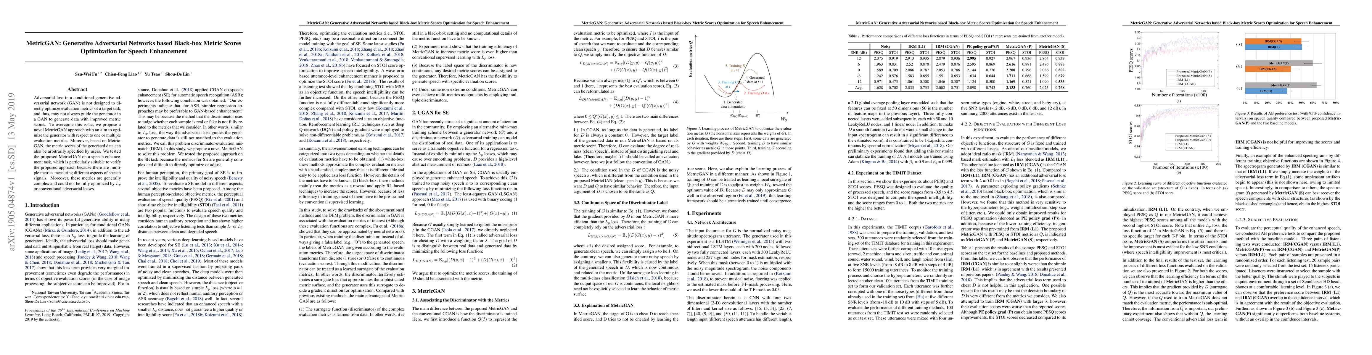 MetricGAN optimizes a GAN's generator to improve specific evaluation metrics directly, rather than relying on adversarial loss alone. This approach was tested on a speech enhancement task, demonstrating its ability to enhance speech signals with specified metric scores.