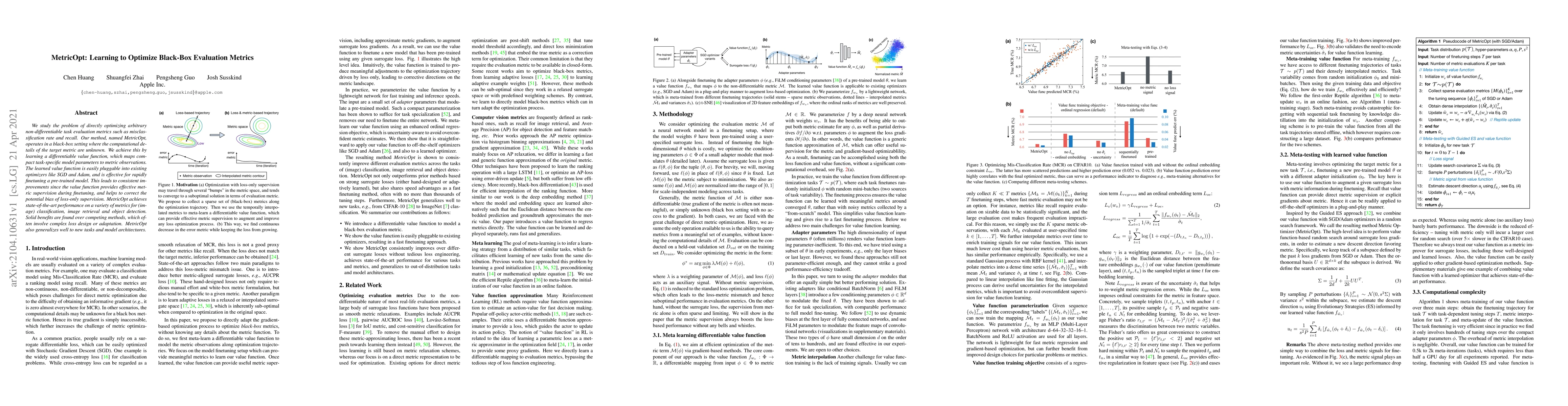A new method called MetricOpt learns to optimize arbitrary non-differentiable evaluation metrics for machine learning models, achieving state-of-the-art performance in image classification, retrieval, and object detection.