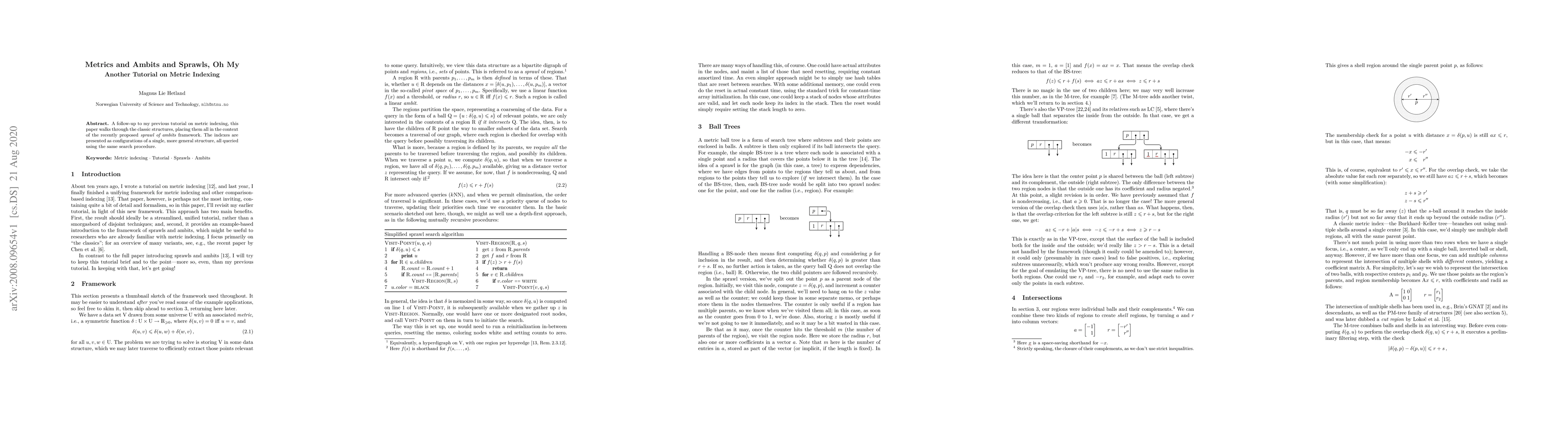 A follow-up to my previous tutorial on metric indexing, this paper walks through the classic structures, placing them all in the context of the recently proposed "sprawl of ambits" framework. The indexes are presented as configurations of a single, more general structure, all queried using the same search procedure.