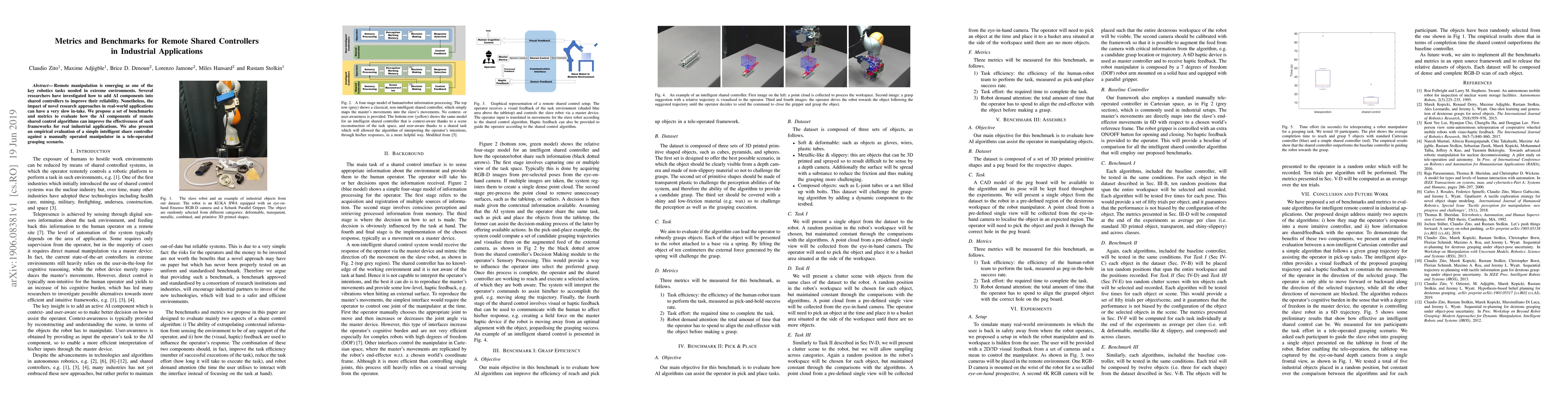 This paper proposes benchmarks and metrics to evaluate AI components in remote shared control algorithms for industrial applications, aiming to improve their effectiveness. The authors also empirically assess a simple intelligent shared controller against a manually operated manipulator in a tele-operated grasping scenario.