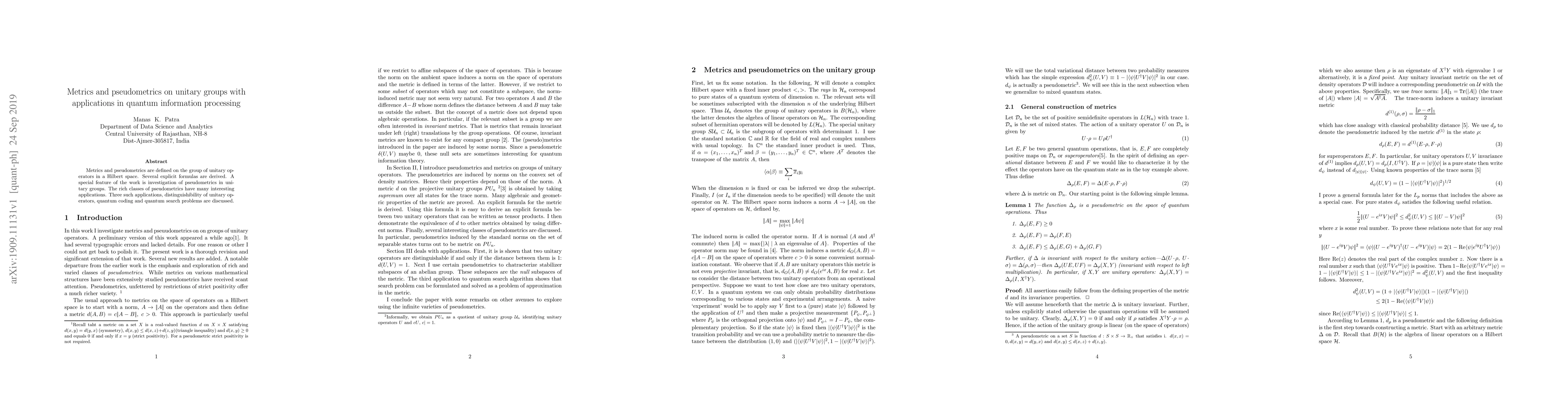 Metrics and pseudometrics are defined on the group of unitary operators in a Hilbert space. Several explicit formulas are derived. A special feature of the work is investigation of pseudometrics in unitary groups. The rich classes of pseudometrics have many interesting applications. Three such applications, distinguishibility of unitary operators, quantum coding and quantum search problems are discussed.