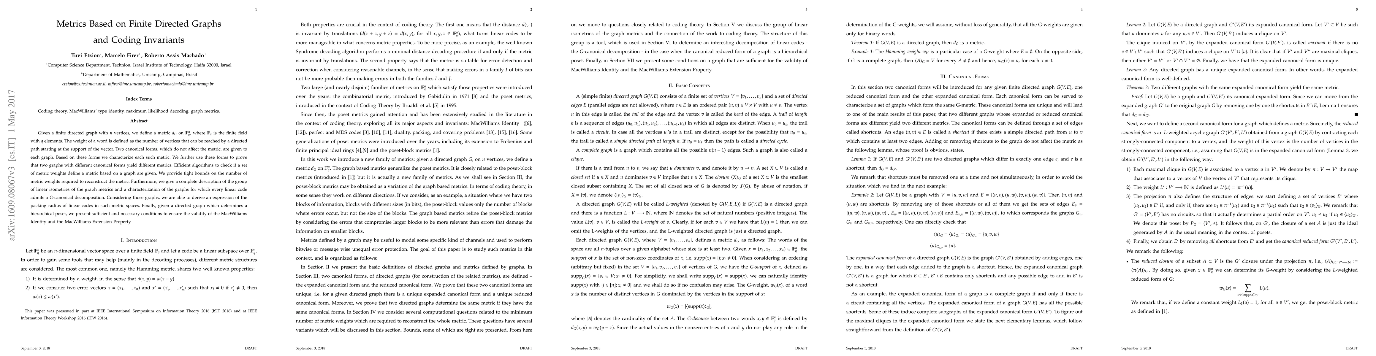 This paper defines a metric $d_G$ on $\mathbb{F}_q^n$ based on finite directed graphs and characterizes metrics derived from different canonical forms of these graphs. It also provides algorithms to verify metric weights and discusses the group of linear isometries and the packing radius of linear codes in these metric spaces.