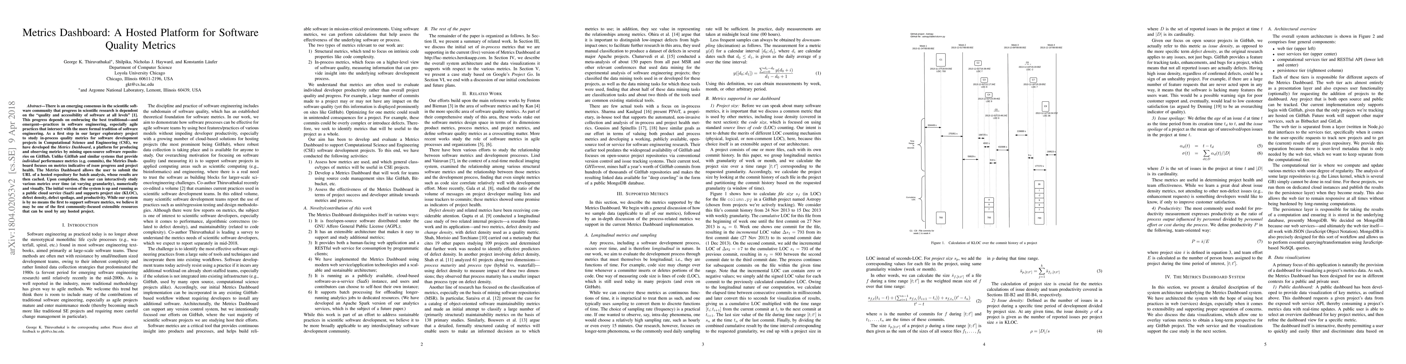 The Metrics Dashboard is a hosted platform for analyzing software quality metrics by mining GitHub repositories, focusing on team progress and project health rather than individual metrics. It offers interactive visualizations of project size, defect density, defect spoilage, and productivity, and is available as a public cloud service.