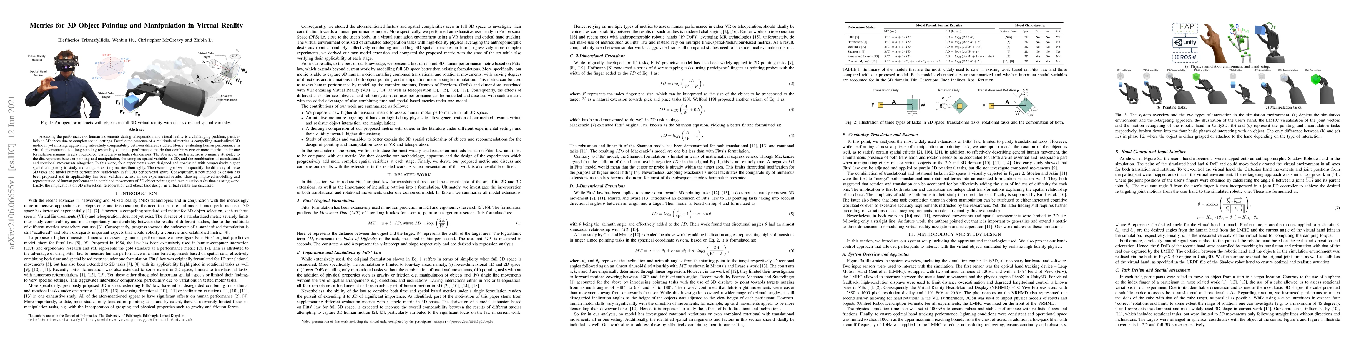 This paper investigates the lack of standardized metrics for assessing human performance in 3D object pointing and manipulation in virtual reality, proposing a new model extension validated through experiments with increasing spatial complexity. The new model demonstrates improved representation of human performance in combined 3D movements compared to existing metrics.