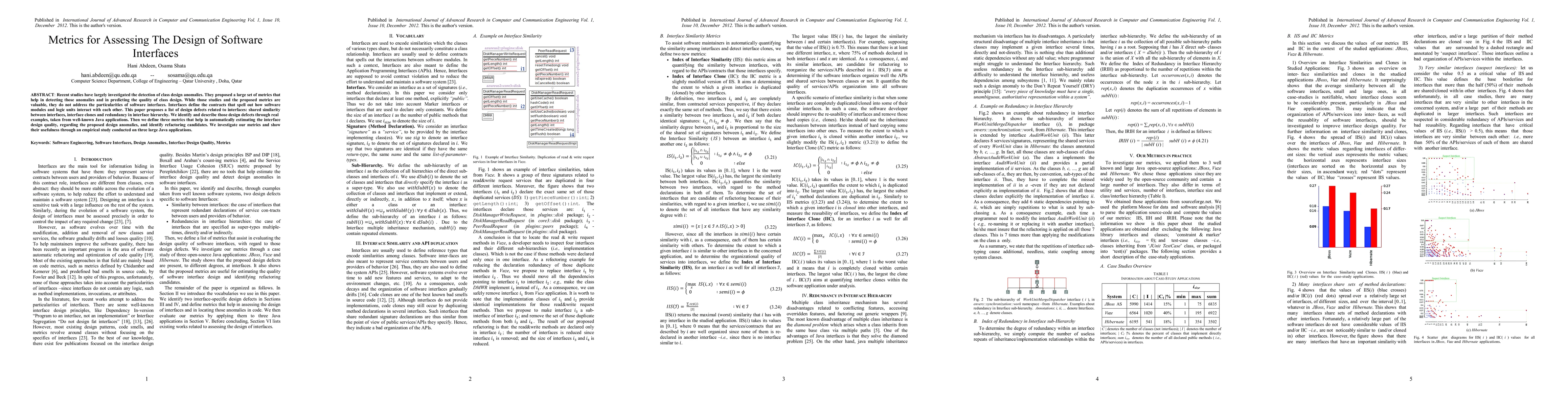 This paper proposes new metrics to assess the design quality of software interfaces, focusing on defects like shared similarity, interface clones, and redundancy in hierarchy. It introduces three metrics for automatic evaluation and demonstrates their effectiveness through an empirical study on large Java applications.
