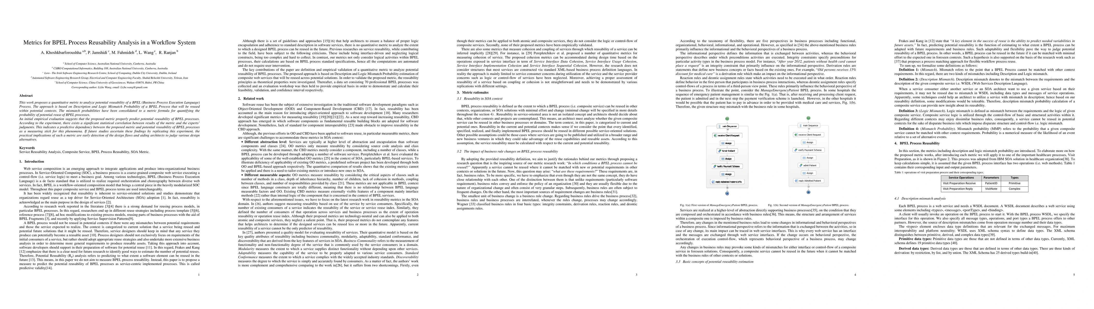 This work proposes a quantitative metric to analyze potential reusability of a BPEL (Business Process Execution Language) Process. The approach is based on Description and Logic Mismatch Probability of a BPEL Process that will be reused within potential contexts. The mismatch probabilities have been consolidated to a metric formula for quantifying the probability of potential reuse of BPEL processes. An initial empirical evaluation suggests that the proposed metric properly predict potential reusability of BPEL processes. According to the experiment, there exists a significant statistical correlation between results of the metric and the experts judgements. This indicates a predictive dependency between the proposed metric and potential reusability of BPEL processes as a measuring stick for this phenomena. If future studies ascertain these findings by replicating this experiment, the practical implications of such a metric are early detection of the design flaws and aiding architects to judge various design alternatives.