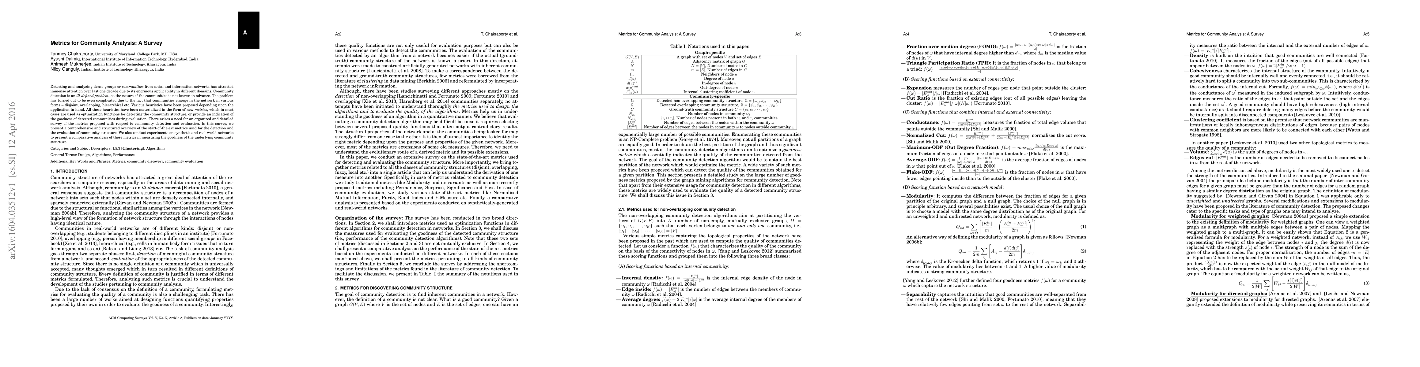 Detecting and analyzing dense groups or communities from social and information networks has attracted immense attention over last one decade due to its enormous applicability in different domains. Community detection is an ill-defined problem, as the nature of the communities is not known in advance. The problem has turned out to be even complicated due to the fact that communities emerge in the network in various forms - disjoint, overlapping, hierarchical etc. Various heuristics have been proposed depending upon the application in hand. All these heuristics have been materialized in the form of new metrics, which in most cases are used as optimization functions for detecting the community structure, or provide an indication of the goodness of detected communities during evaluation. There arises a need for an organized and detailed survey of the metrics proposed with respect to community detection and evaluation. In this survey, we present a comprehensive and structured overview of the start-of-the-art metrics used for the detection and the evaluation of community structure. We also conduct experiments on synthetic and real-world networks to present a comparative analysis of these metrics in measuring the goodness of the underlying community structure.