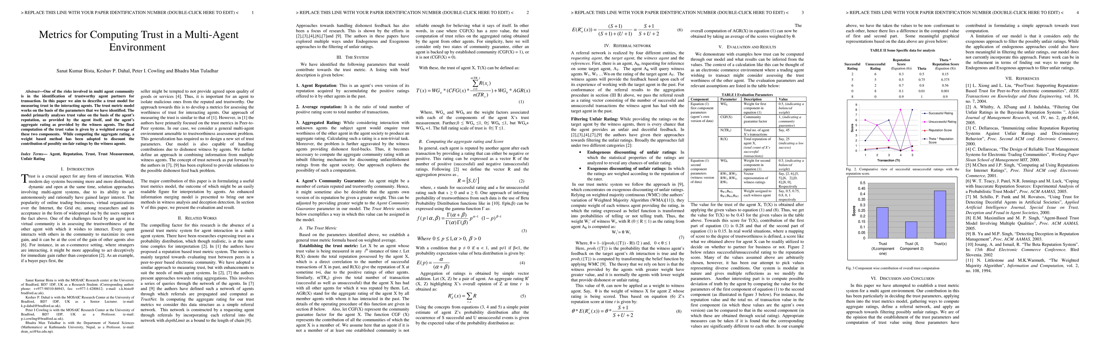Researchers developed a trust model to measure trustworthy agent partners in multi-agent environments, combining an agent's reputation with witness agents' aggregate ratings, using a weighted average.