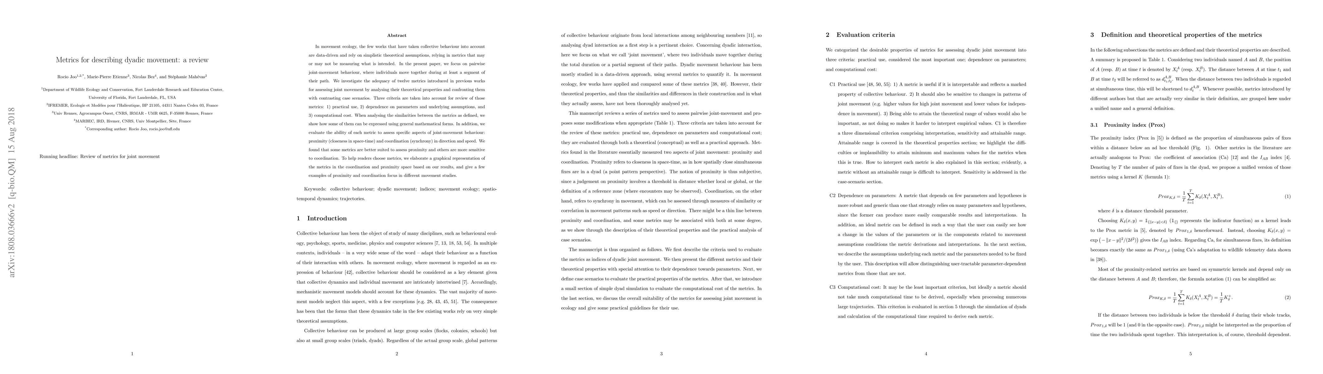 In movement ecology, the few works that have taken collective behaviour into account are data-driven and rely on simplistic theoretical assumptions, relying in metrics that may or may not be measuring what is intended. In the present paper, we focus on pairwise joint-movement behaviour, where individuals move together during at least a segment of their path. We investigate the adequacy of twelve metrics introduced in previous works for assessing joint movement by analysing their theoretical properties and confronting them with contrasting case scenarios. Three criteria are taken into account for review of those metrics: 1) practical use, 2) dependence on parameters and underlying assumptions, and 3) computational cost. When analysing the similarities between the metrics as defined, we show how some of them can be expressed using general mathematical forms. In addition, we evaluate the ability of each metric to assess specific aspects of joint-movement behaviour: proximity (closeness in space-time) and coordination (synchrony) in direction and speed. We found that some metrics are better suited to assess proximity and others are more sensitive to coordination. To help readers choose metrics, we elaborate a graphical representation of the metrics in the coordination and proximity space based on our results, and give a few examples of proximity and coordination focus in different movement studies.