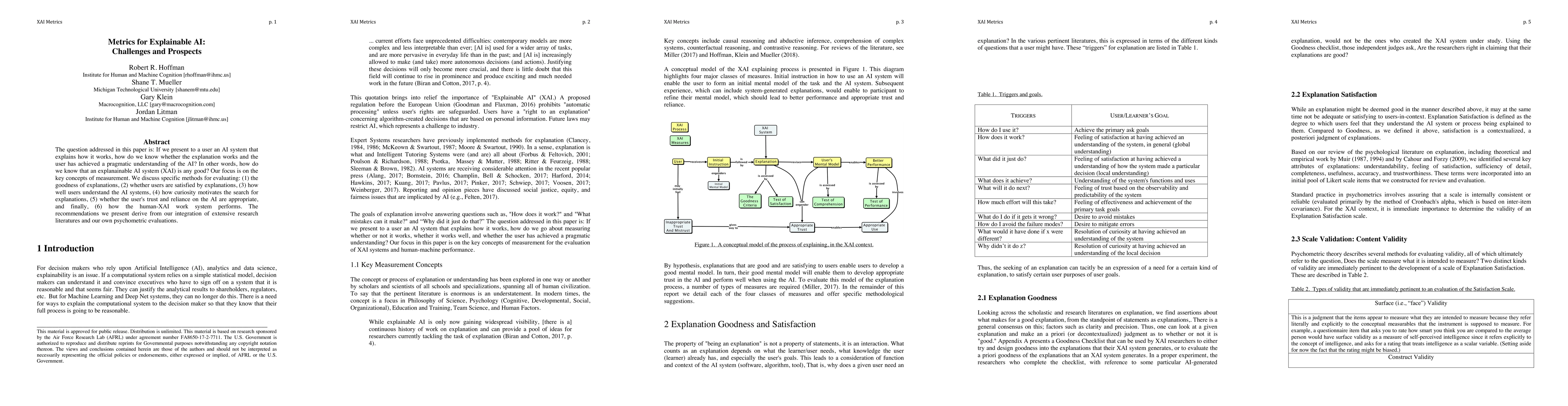 The question addressed in this paper is: If we present to a user an AI system that explains how it works, how do we know whether the explanation works and the user has achieved a pragmatic understanding of the AI? In other words, how do we know that an explanainable AI system (XAI) is any good? Our focus is on the key concepts of measurement. We discuss specific methods for evaluating: (1) the goodness of explanations, (2) whether users are satisfied by explanations, (3) how well users understand the AI systems, (4) how curiosity motivates the search for explanations, (5) whether the user's trust and reliance on the AI are appropriate, and finally, (6) how the human-XAI work system performs. The recommendations we present derive from our integration of extensive research literatures and our own psychometric evaluations.