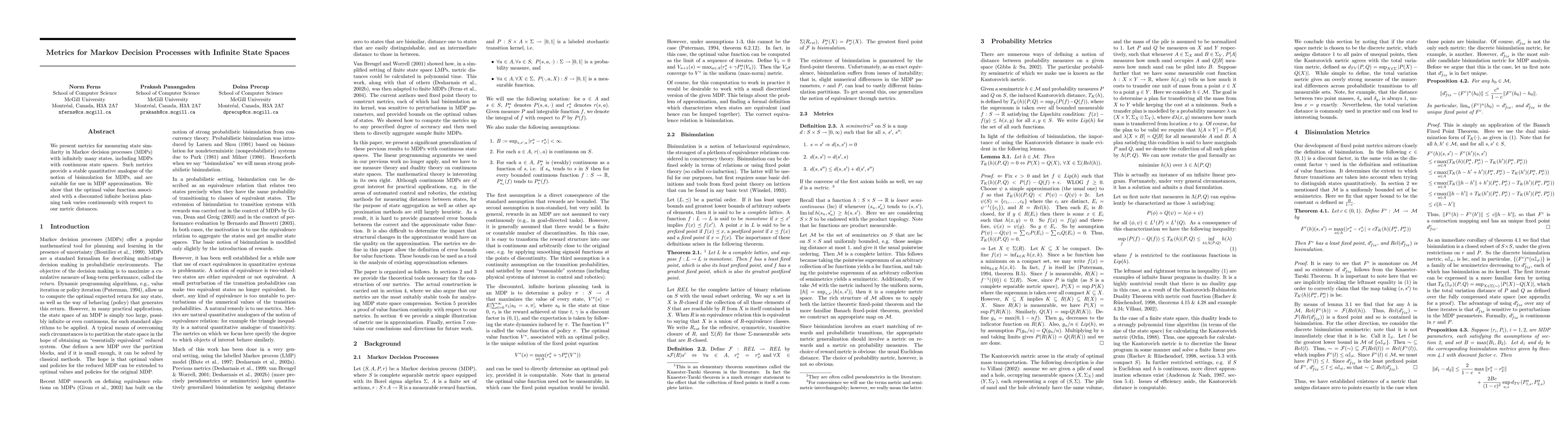 This paper introduces metrics for assessing state similarity in Markov Decision Processes (MDPs) with infinite state spaces, including continuous ones. These metrics enable stable quantitative comparisons akin to bisimulation and support MDP approximation, demonstrating that the optimal value function changes continuously with respect to these distances.