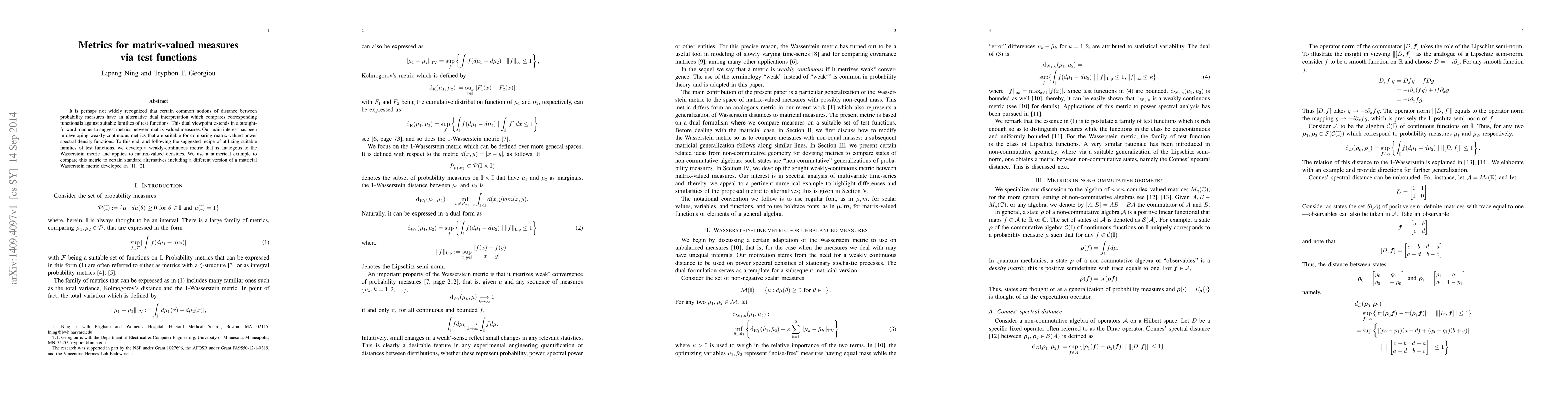 It is perhaps not widely recognized that certain common notions of distance between probability measures have an alternative dual interpretation which compares corresponding functionals against suitable families of test functions. This dual viewpoint extends in a straightforward manner to suggest metrics between matrix-valued measures. Our main interest has been in developing weakly-continuous metrics that are suitable for comparing matrix-valued power spectral density functions. To this end, and following the suggested recipe of utilizing suitable families of test functions, we develop a weakly-continuous metric that is analogous to the Wasserstein metric and applies to matrix-valued densities. We use a numerical example to compare this metric to certain standard alternatives including a different version of a matricial Wasserstein metric developed earlier.