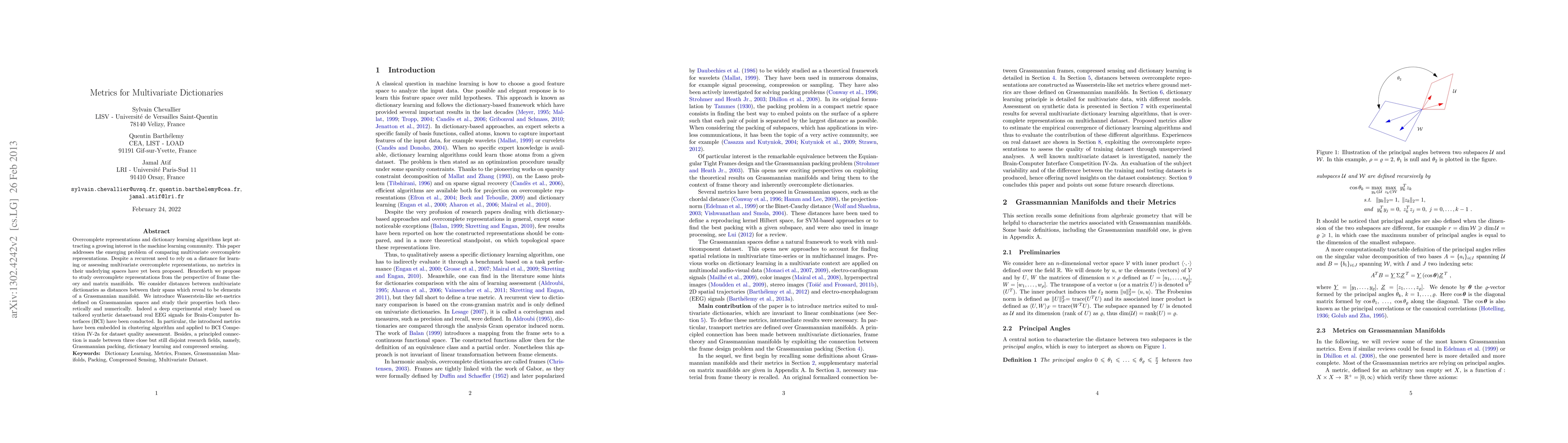 Overcomplete representations and dictionary learning algorithms kept attracting a growing interest in the machine learning community. This paper addresses the emerging problem of comparing multivariate overcomplete representations. Despite a recurrent need to rely on a distance for learning or assessing multivariate overcomplete representations, no metrics in their underlying spaces have yet been proposed. Henceforth we propose to study overcomplete representations from the perspective of frame theory and matrix manifolds. We consider distances between multivariate dictionaries as distances between their spans which reveal to be elements of a Grassmannian manifold. We introduce Wasserstein-like set-metrics defined on Grassmannian spaces and study their properties both theoretically and numerically. Indeed a deep experimental study based on tailored synthetic datasetsand real EEG signals for Brain-Computer Interfaces (BCI) have been conducted. In particular, the introduced metrics have been embedded in clustering algorithm and applied to BCI Competition IV-2a for dataset quality assessment. Besides, a principled connection is made between three close but still disjoint research fields, namely, Grassmannian packing, dictionary learning and compressed sensing.