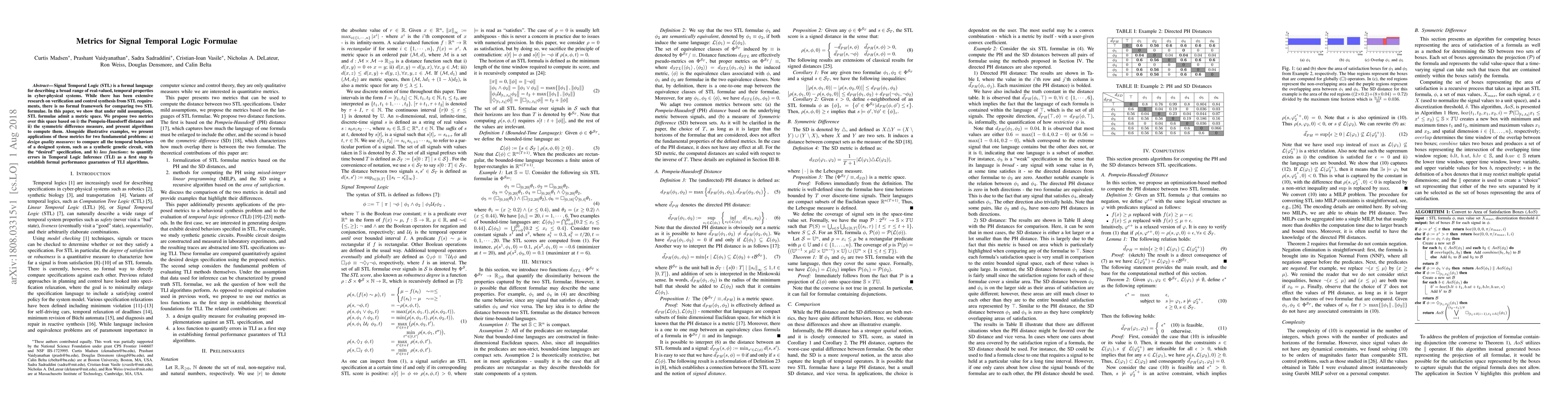 Signal Temporal Logic (STL) is a formal language for describing a broad range of real-valued, temporal properties in cyber-physical systems. While there has been extensive research on verification and control synthesis from STL requirements, there is no formal framework for comparing two STL formulae. In this paper, we show that under mild assumptions, STL formulae admit a metric space. We propose two metrics over this space based on i) the Pompeiu-Hausdorff distance and ii) the symmetric difference measure, and present algorithms to compute them. Alongside illustrative examples, we present applications of these metrics for two fundamental problems: a) design quality measures: to compare all the temporal behaviors of a designed system, such as a synthetic genetic circuit, with the "desired" specification, and b) loss functions: to quantify errors in Temporal Logic Inference (TLI) as a first step to establish formal performance guarantees of TLI algorithms.