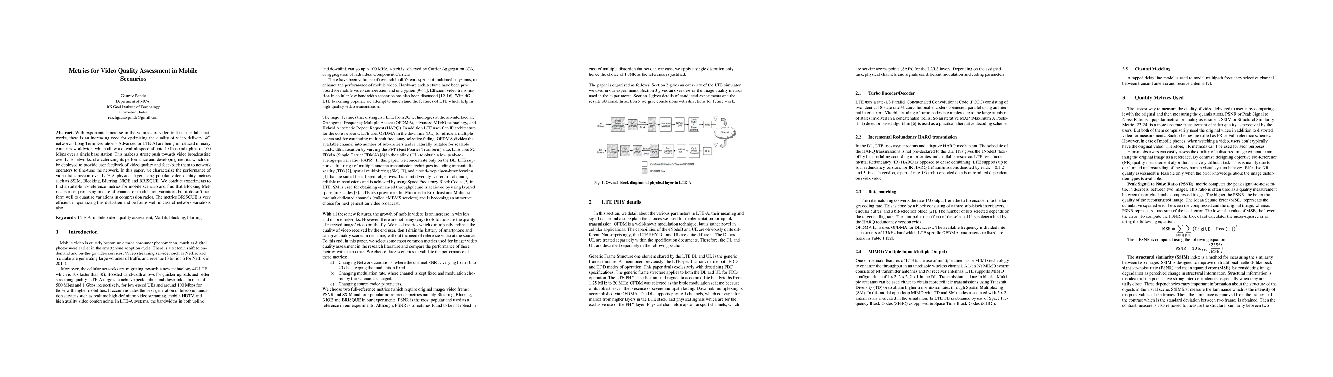 A study evaluates video quality metrics in mobile LTE networks to optimize video delivery, finding that Blocking Metrics performs well for channel variations but not compression ratios, while BRISQUE is efficient in quantizing distortion.