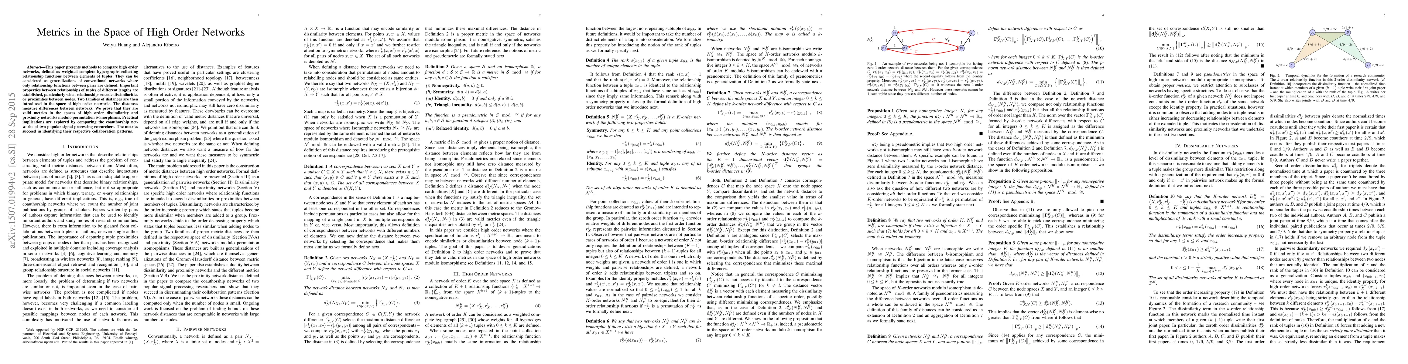 This paper presents methods to compare high order networks, defined as weighted complete hypergraphs collecting relationship functions between elements of tuples. They can be considered as generalizations of conventional networks where only relationship functions between pairs are defined. Important properties between relationships of tuples of different lengths are established, particularly when relationships encode dissimilarities or proximities between nodes. Two families of distances are then introduced in the space of high order networks. The distances measure differences between networks. We prove that they are valid metrics in the spaces of high order dissimilarity and proximity networks modulo permutation isomorphisms. Practical implications are explored by comparing the coauthorship networks of two popular signal processing researchers. The metrics succeed in identifying their respective collaboration patterns.