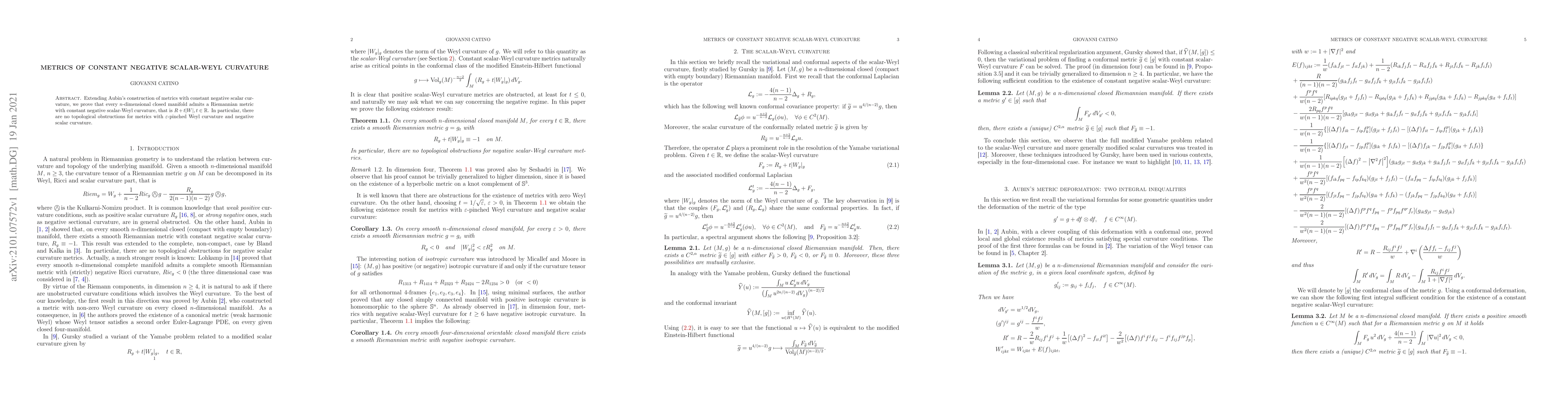 Extending Aubin's construction of metrics with constant negative scalar curvature, we prove that every $n$-dimensional closed manifold admits a Riemannian metric with constant negative scalar-Weyl curvature, that is $R+t|W|, t\in\mathbb{R}$. In particular, there are no topological obstructions for metrics with $\varepsilon$-pinched Weyl curvature and negative scalar curvature.