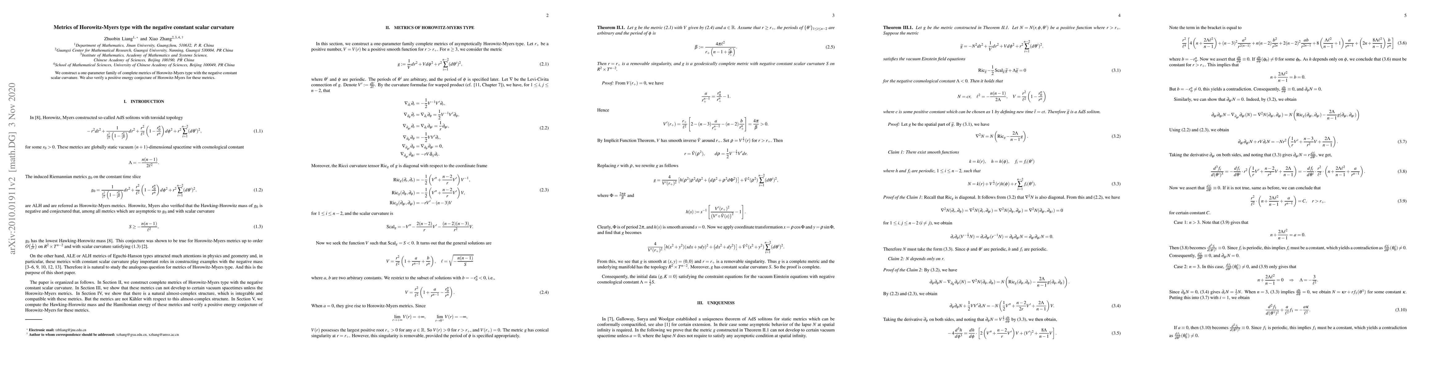 This paper constructs a family of complete metrics of Horowitz-Myers type featuring negative constant scalar curvature and verifies a positive energy conjecture for these metrics. The study provides significant insights into the geometric properties of such metrics.
