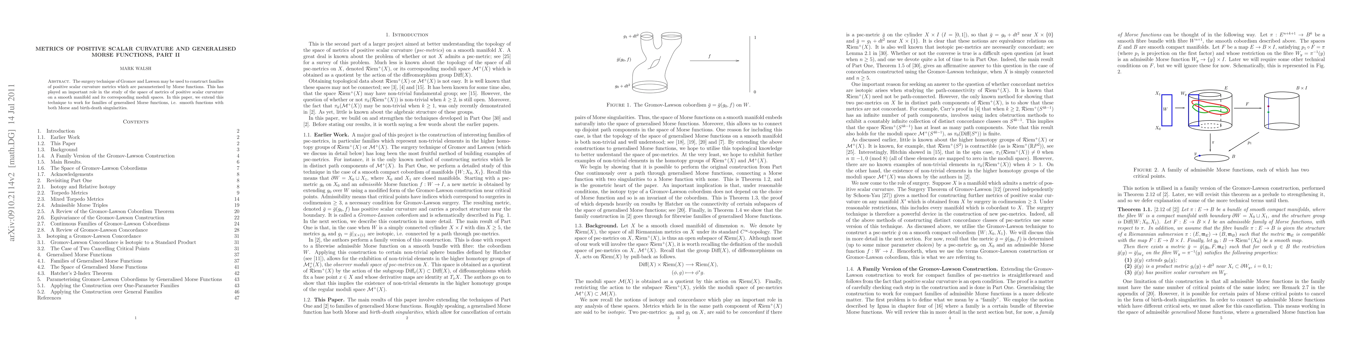 Summary: This paper extends Gromov and Lawson's surgery technique to construct families of positive scalar curvature metrics parameterized by generalised Morse functions, encompassing both Morse and birth-death singularities, thereby advancing the study of metrics and moduli spaces with positive scalar curvature.