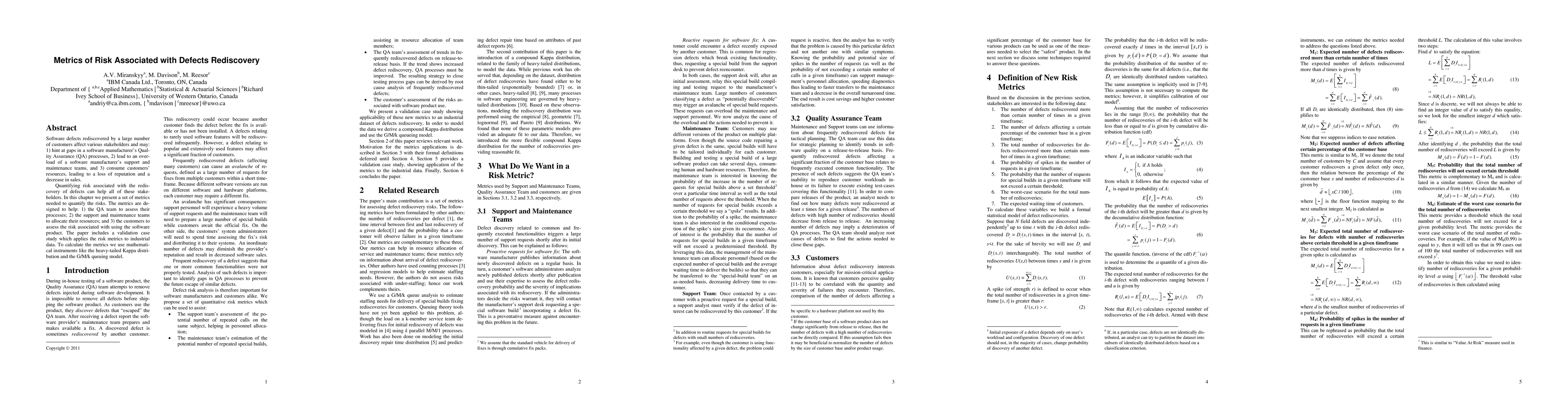 A research paper introduces metrics to quantify risk associated with software defects rediscovery, helping stakeholders assess quality processes, allocate resources, and evaluate customer risks. It provides a validation case study using industrial data and applies mathematical models like the heavy-tailed Kappa distribution and G/M/k queuing model.