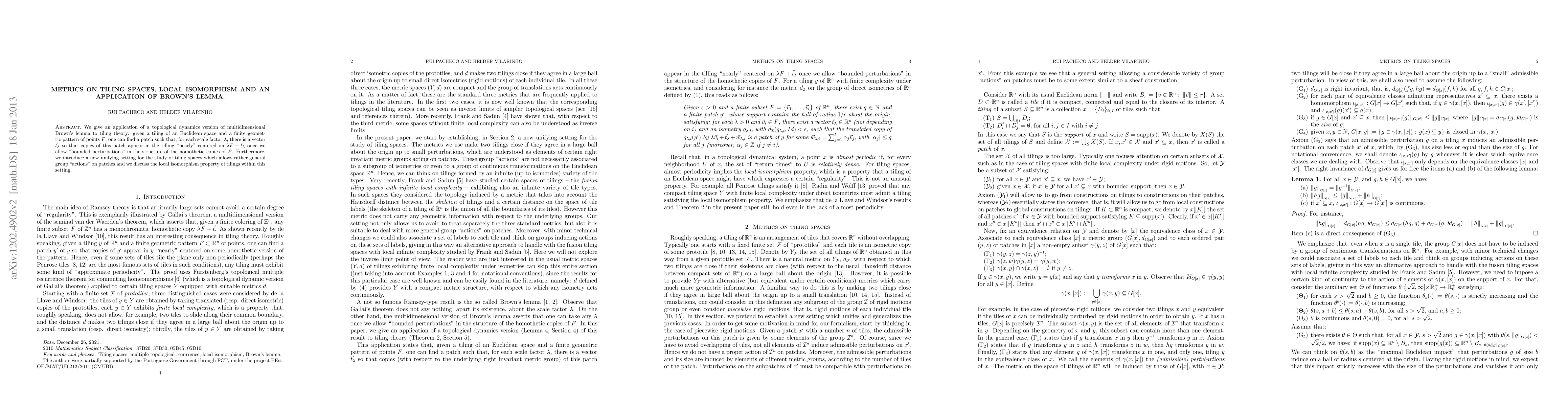 We give an application of a topological dynamics version of multidimensional Brown's lemma to tiling theory: given a tiling of an Euclidean space and a finite geometric pattern of points $F$, one can find a patch such that, for each scale factor $\lambda$, there is a vector $\vec{t}_\lambda$ so that copies of this patch appear in the tilling "nearly" centered on $\lambda F+\vec{t}_\lambda$ once we allow "bounded perturbations" in the structure of the homothetic copies of $F$. Furthermore, we introduce a new unifying setting for the study of tiling spaces which allows rather general group "actions" on patches and we discuss the local isomorphism property of tilings within this setting.