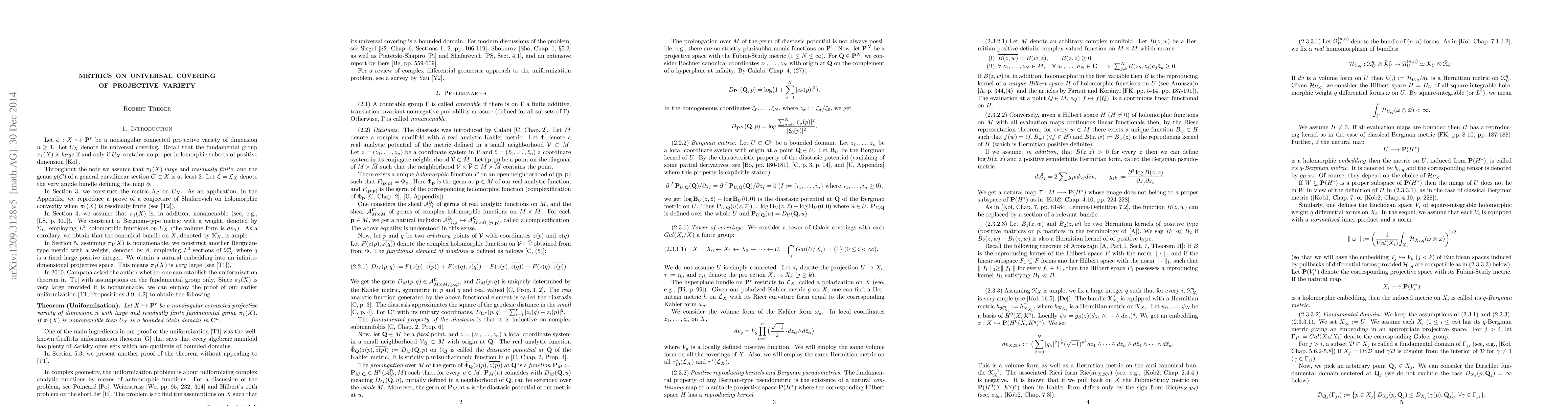 Researchers developed metrics on universal coverings of projective varieties, proving that under certain conditions, these coverings can be bounded Stein domains, with implications for uniformization and the Shafarevich conjecture.