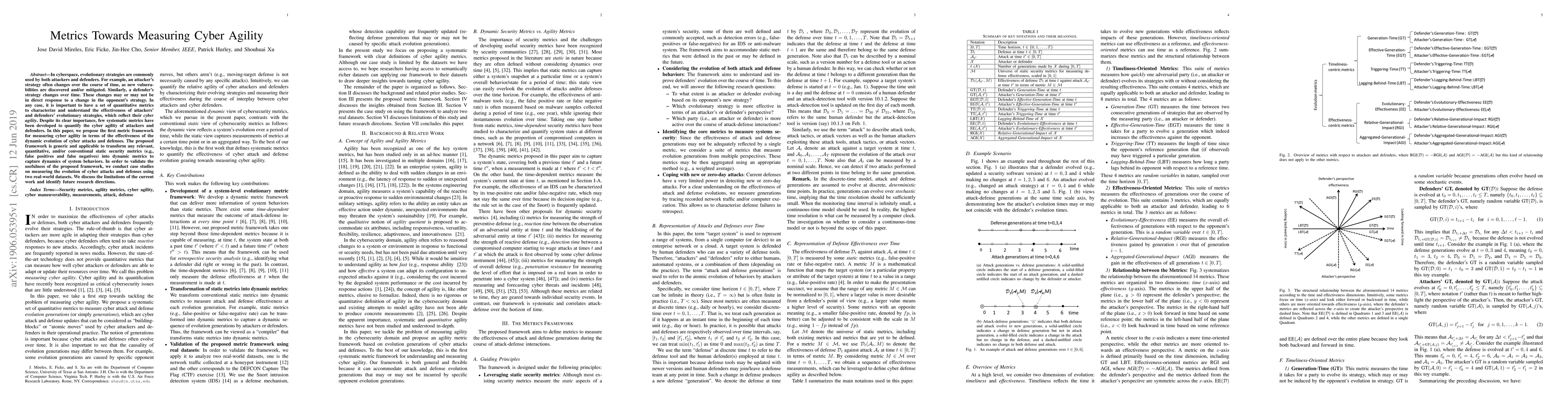 This paper proposes a novel framework for measuring cyber agility through quantitative metrics that assess the dynamic evolution of cyber attacks and defenses. The framework transforms static security metrics into dynamic ones to better capture the adaptability of both attackers and defenders, validated through case studies on real-world datasets.